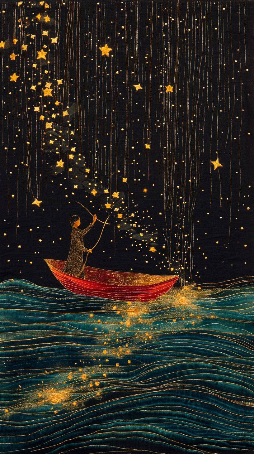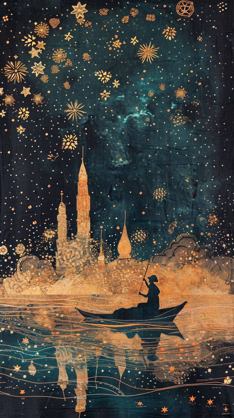 olourful silk and gold embroidery of a ferryman crossing a river of stars, intricate design, minimalism, dark background --ar 9:16 --v 6
