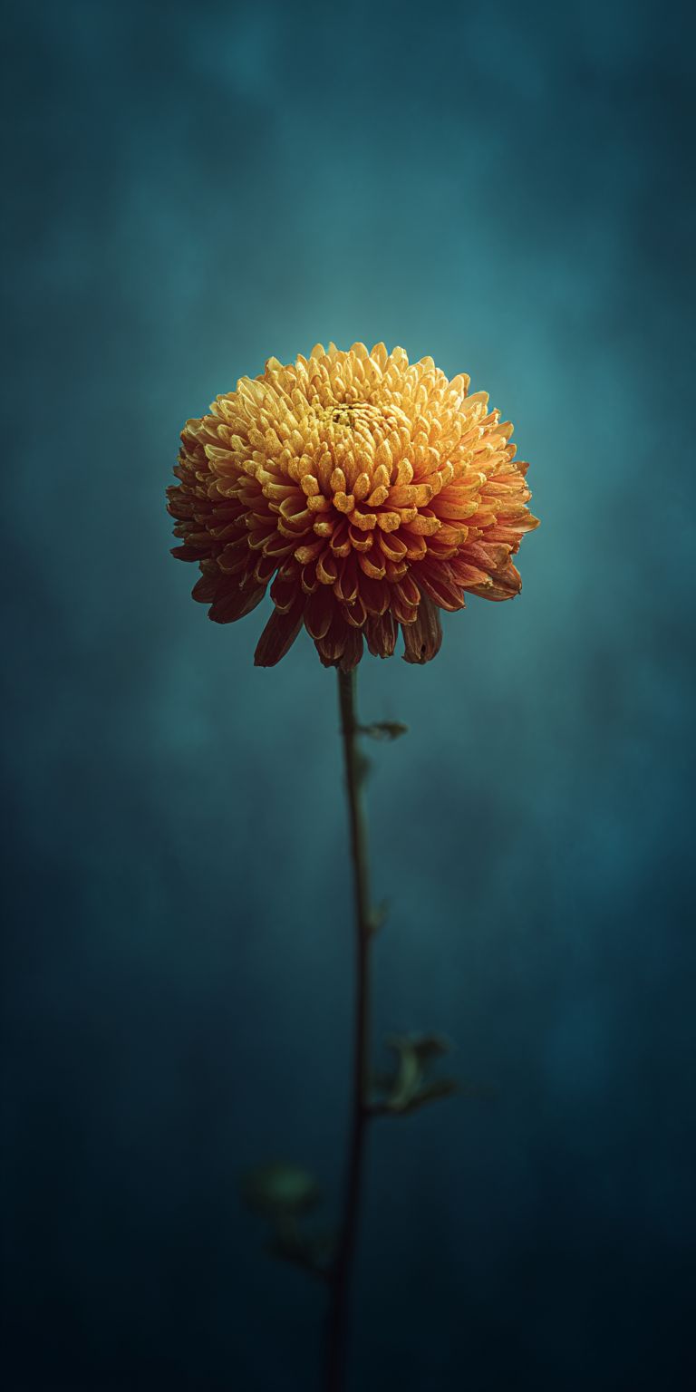 一個單獨的菊花花頭,只有花頭,沒有茎,位於畫面中心,不太大,周圍有溫暖深色的均勻背景,像橫幅的背景,橙色和青藍色花瓣的色調,極簡主義構圖,工作室微距攝影風格,柔和的散射光,超細緻的紋理,優雅而寧靜的氛圍。