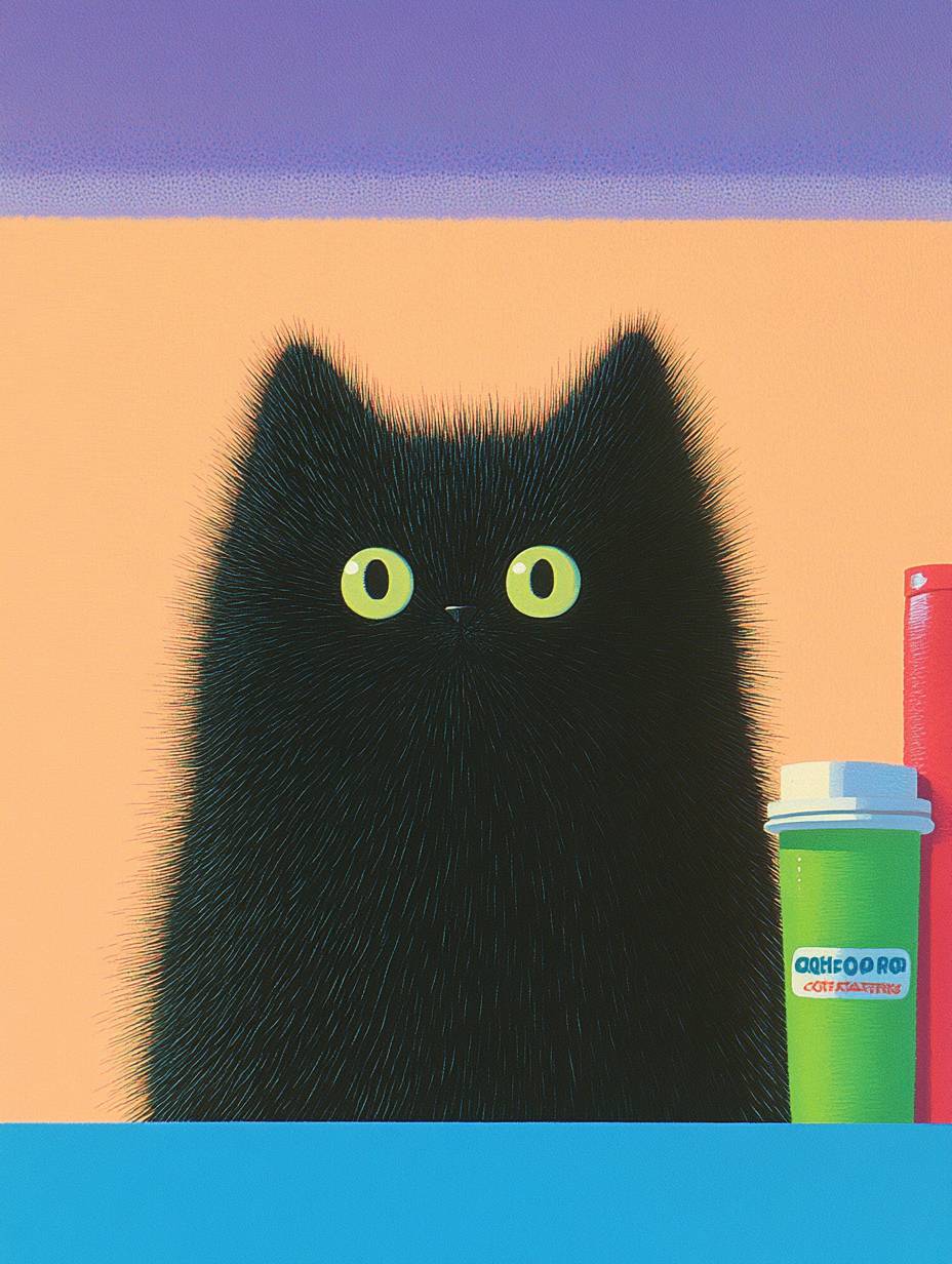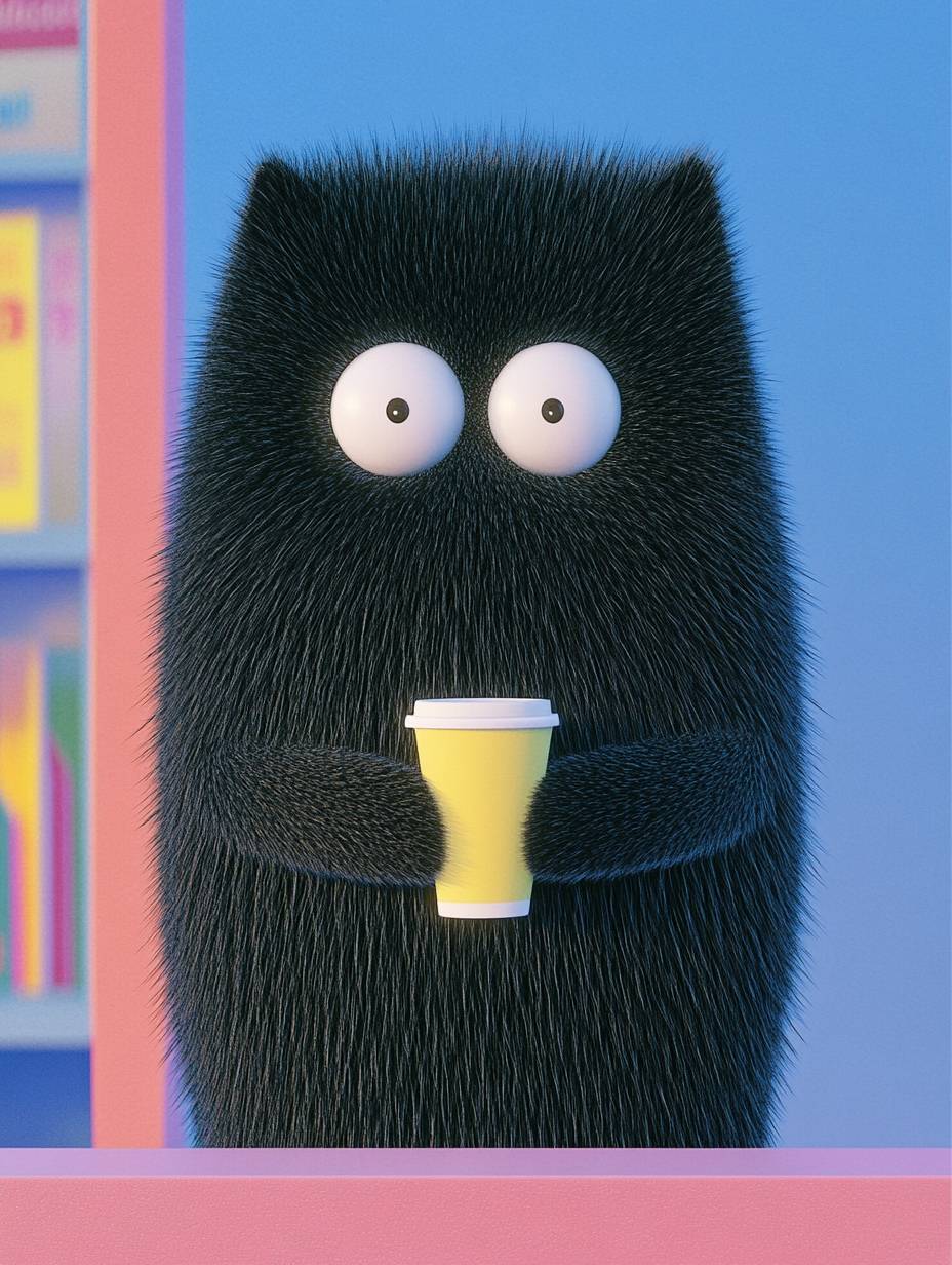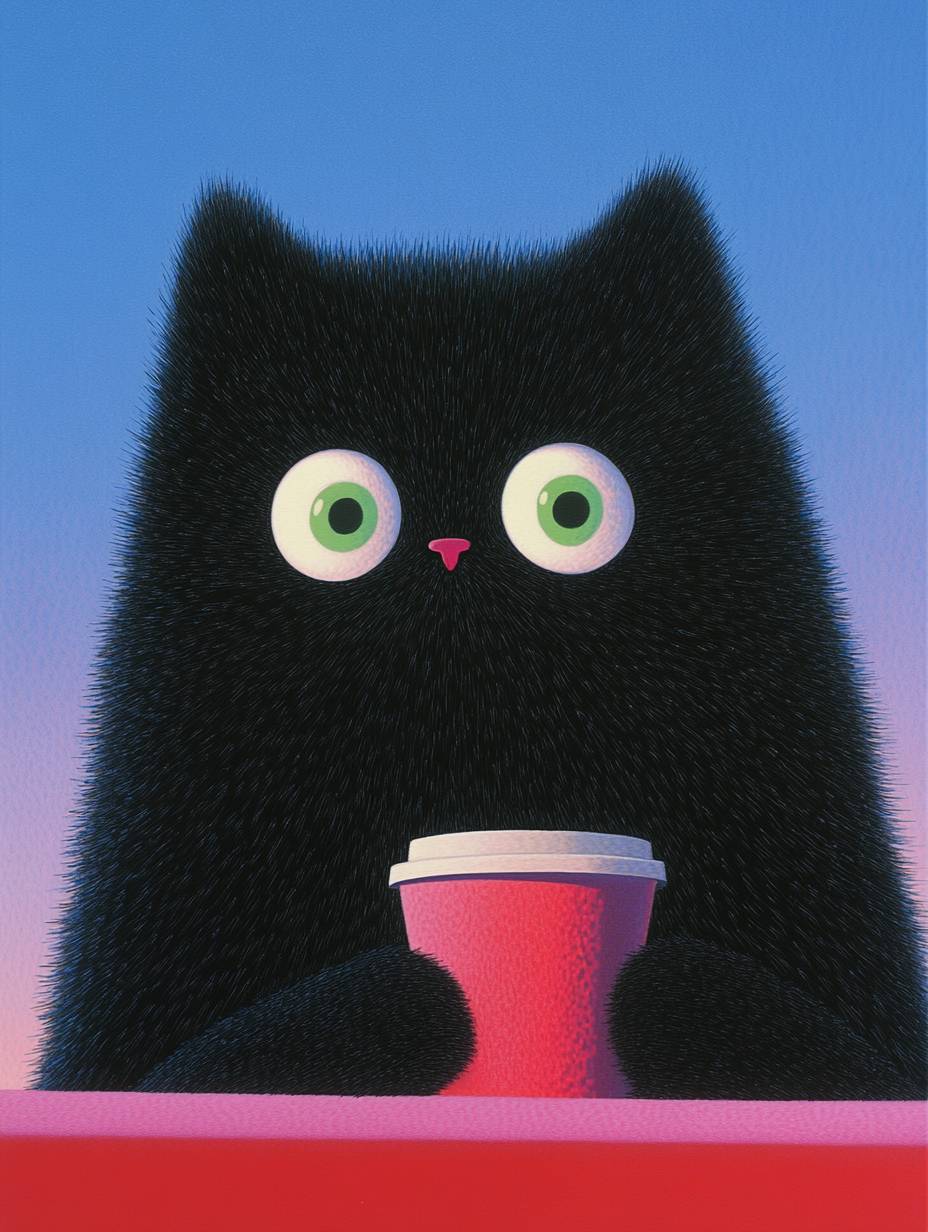 A cute soft black kitten having a coffee in a store, most detailed, 8k --ar 3:4 --style raw --sref 680572301 --profile kzilt9y --stylize 950 --v 6.1