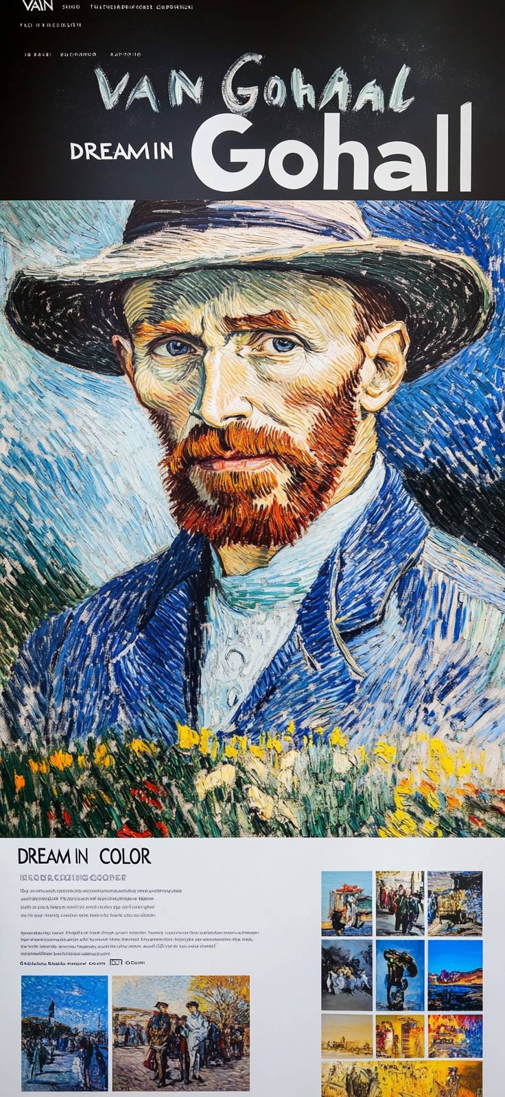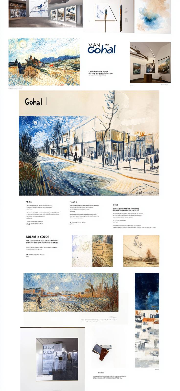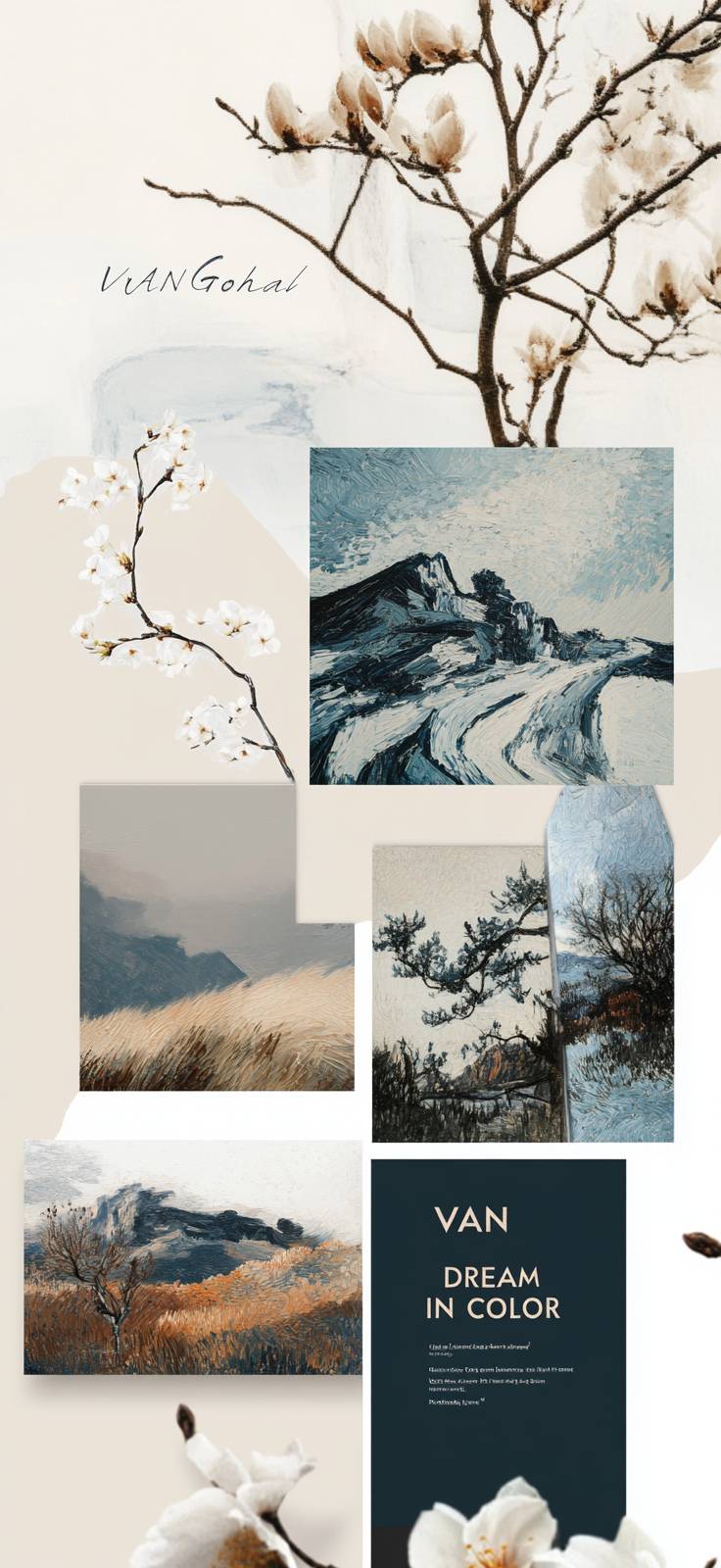 Create an mood board for the exhibition, with Van Gogh's works and images of his landscape paintings. The title "VAN Gohal DREAM IN COLOR" is written in large letters on top, along with details about public garage times and place to visit, and a ticket. White background. Style modern, elegant, minimalist, with elements from van gough’s painting collection. Modern design collage. In style of digital art. --ar 59:128 --v 6.1