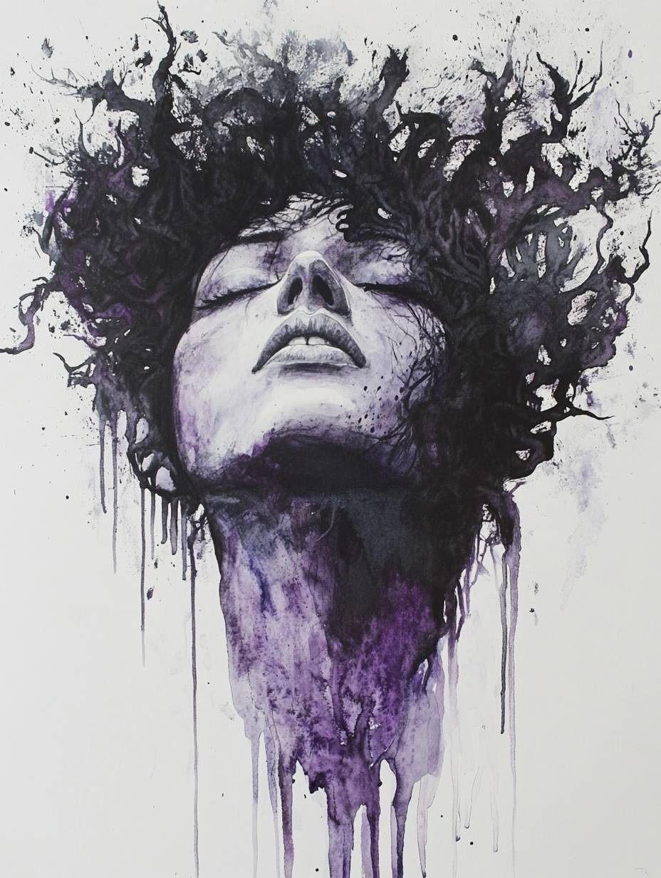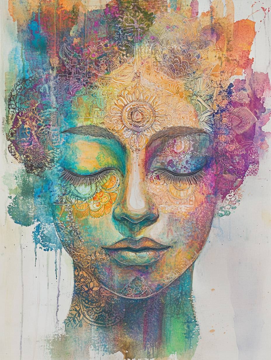 靈性藝術。水彩和丙烯。令人驚嘆的女神索菲亞的形象。墮入物質世界。痛苦。救贖。智慧。神聖知識。女性特質。