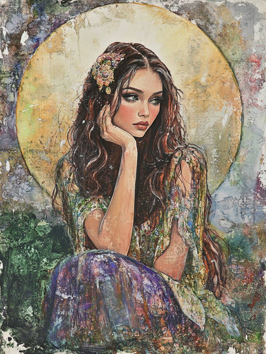 水彩和丙烯畫,令人驚艷的女神索非亞形象,展現出物質世界的痛苦與救贖以及女性的智慧與神聖知識。