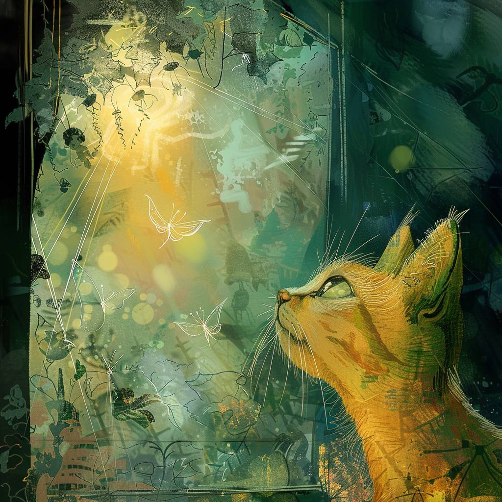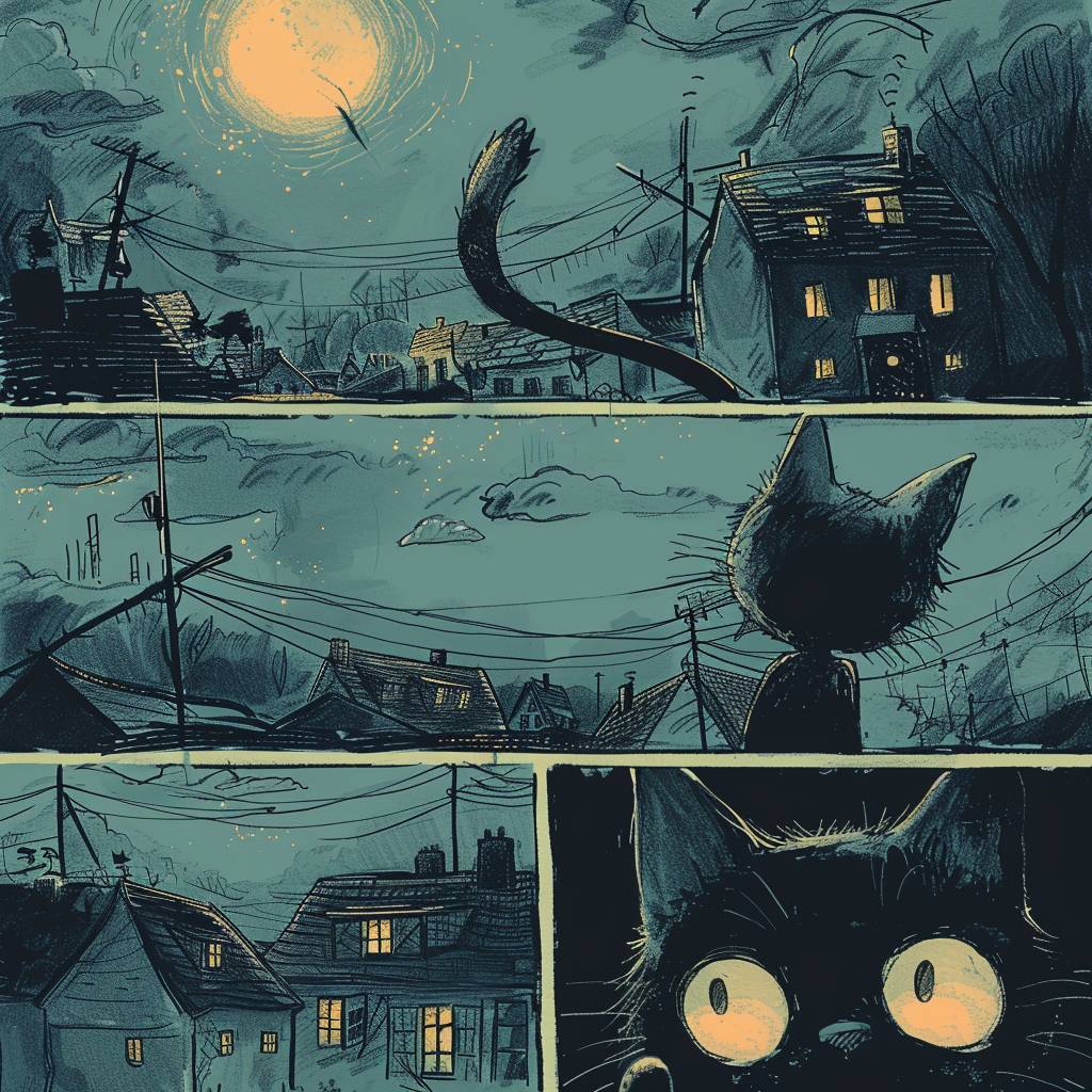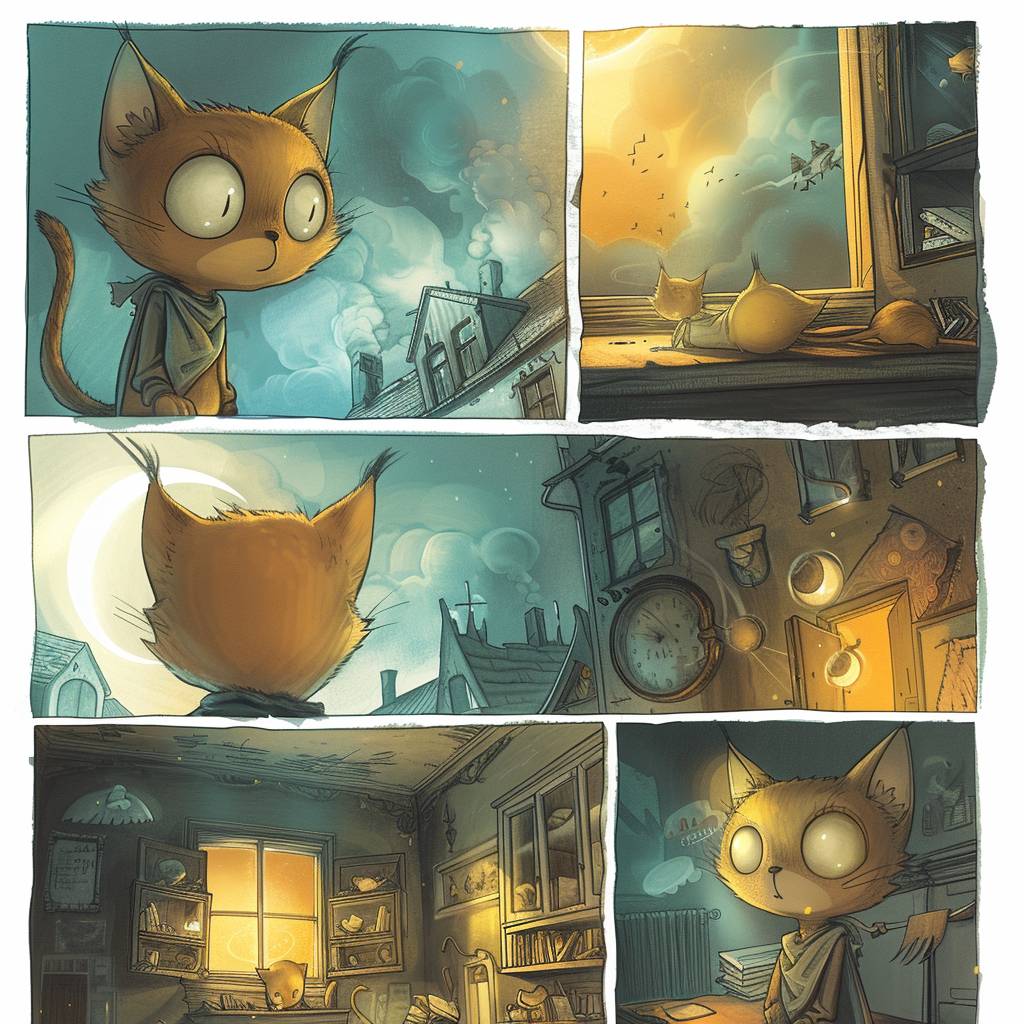 comic strip depicting adventures of young cat. Dreamy moodbyDreamy atmosphere--v 6 --v 6.0