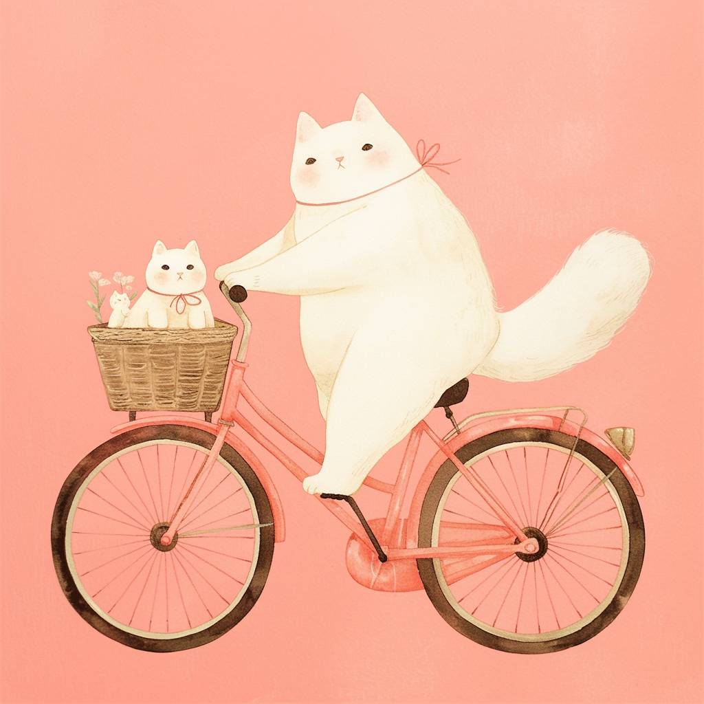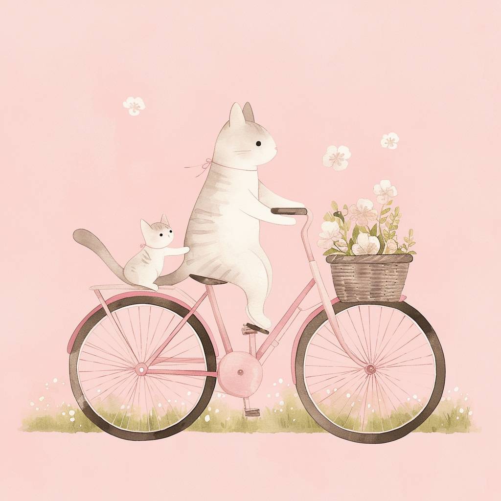 一隻貓騎著單車,前面籃子裡有小貓,背景是粉紅色水彩畫。