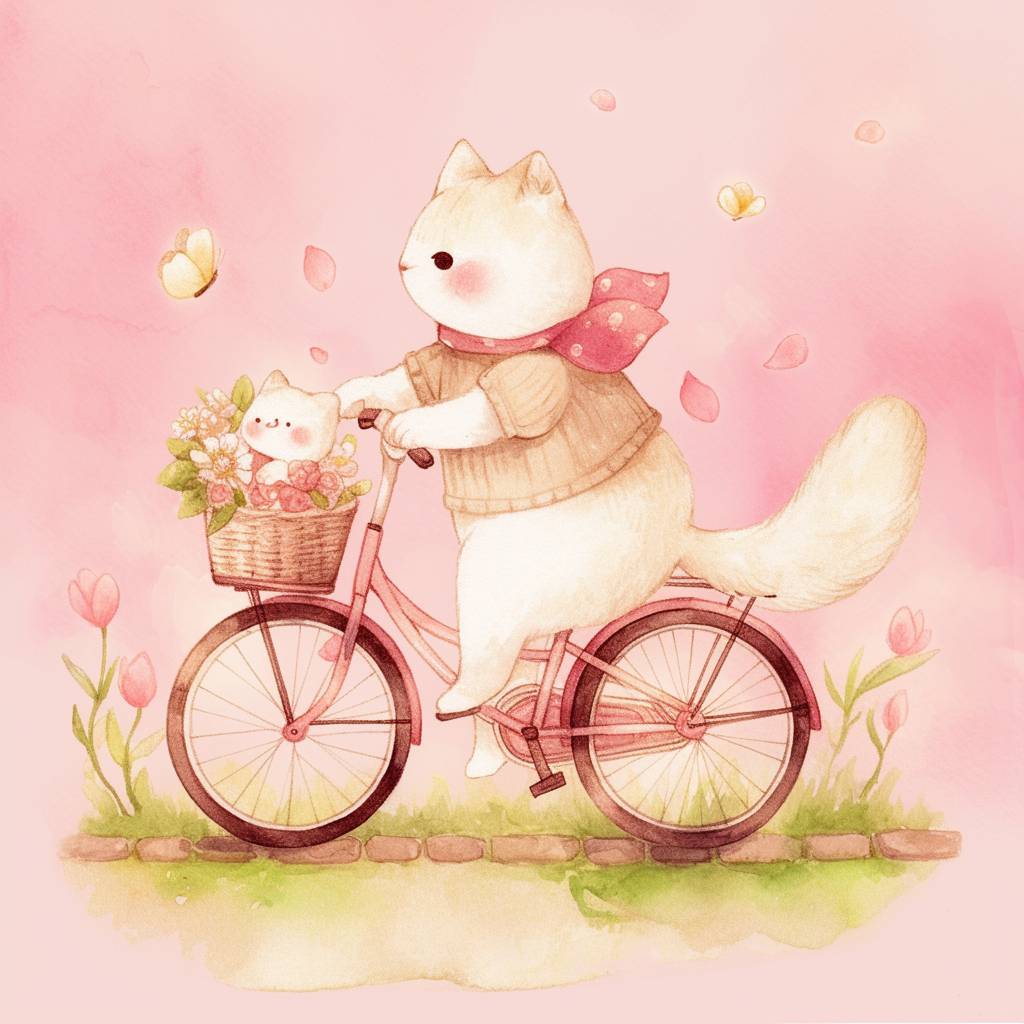 請製作一幅粉紅色背景的水彩畫,畫中有一隻貓騎著單車,前面的籃子裡坐著一隻小貓。