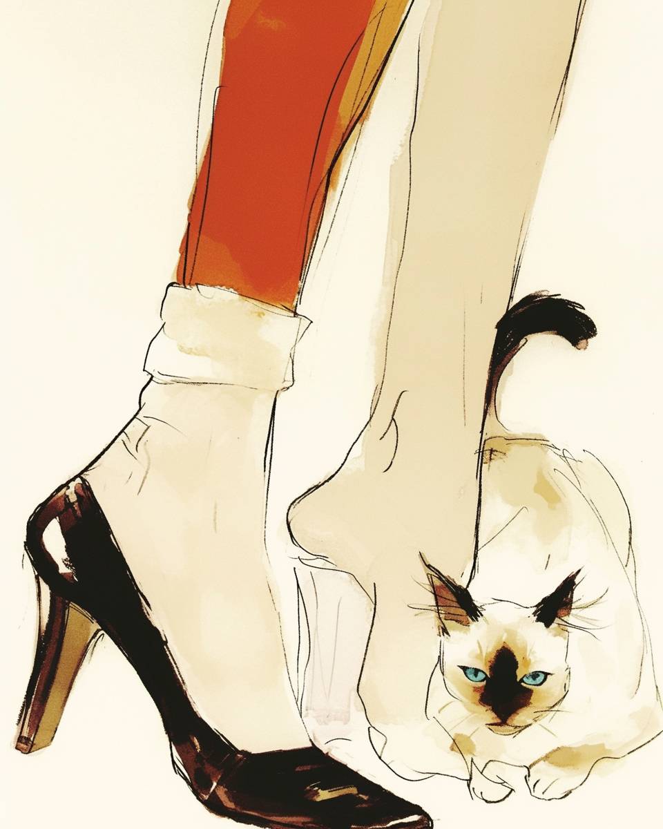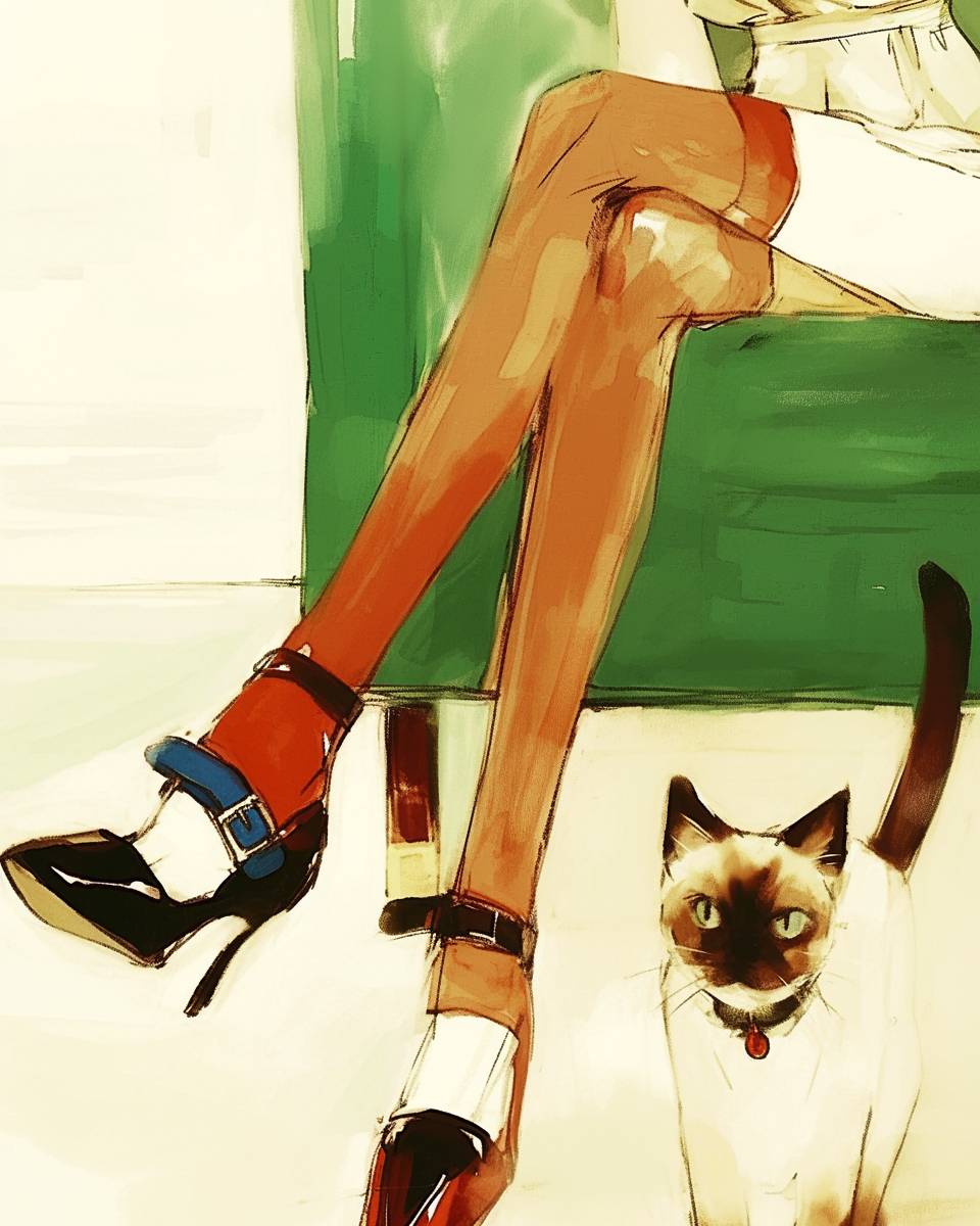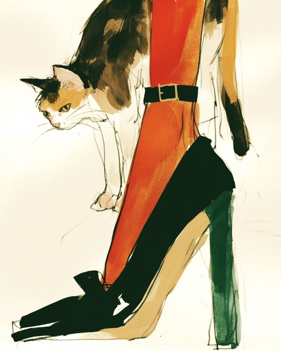 A cat climbs on the leg of a woman in red stockings and high heels --ar 4:5 --sref 3039841018 --niji 6 --style raw