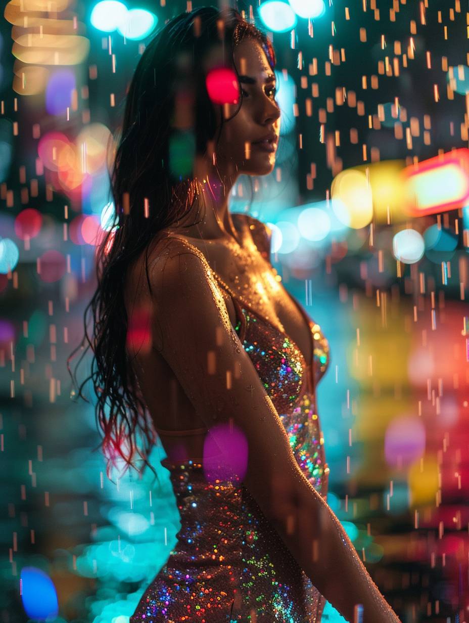 一位穿著短款亮片裙的美麗女子站在雨中。五彩斑斕的燈光映射在水滴上。她的長髮中帶有紅色高光,清晰的面容在模糊的背景中顯得更加突出。