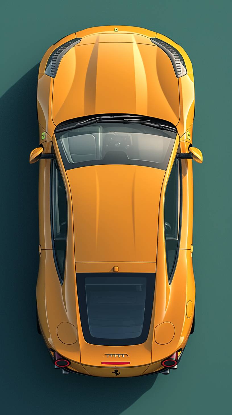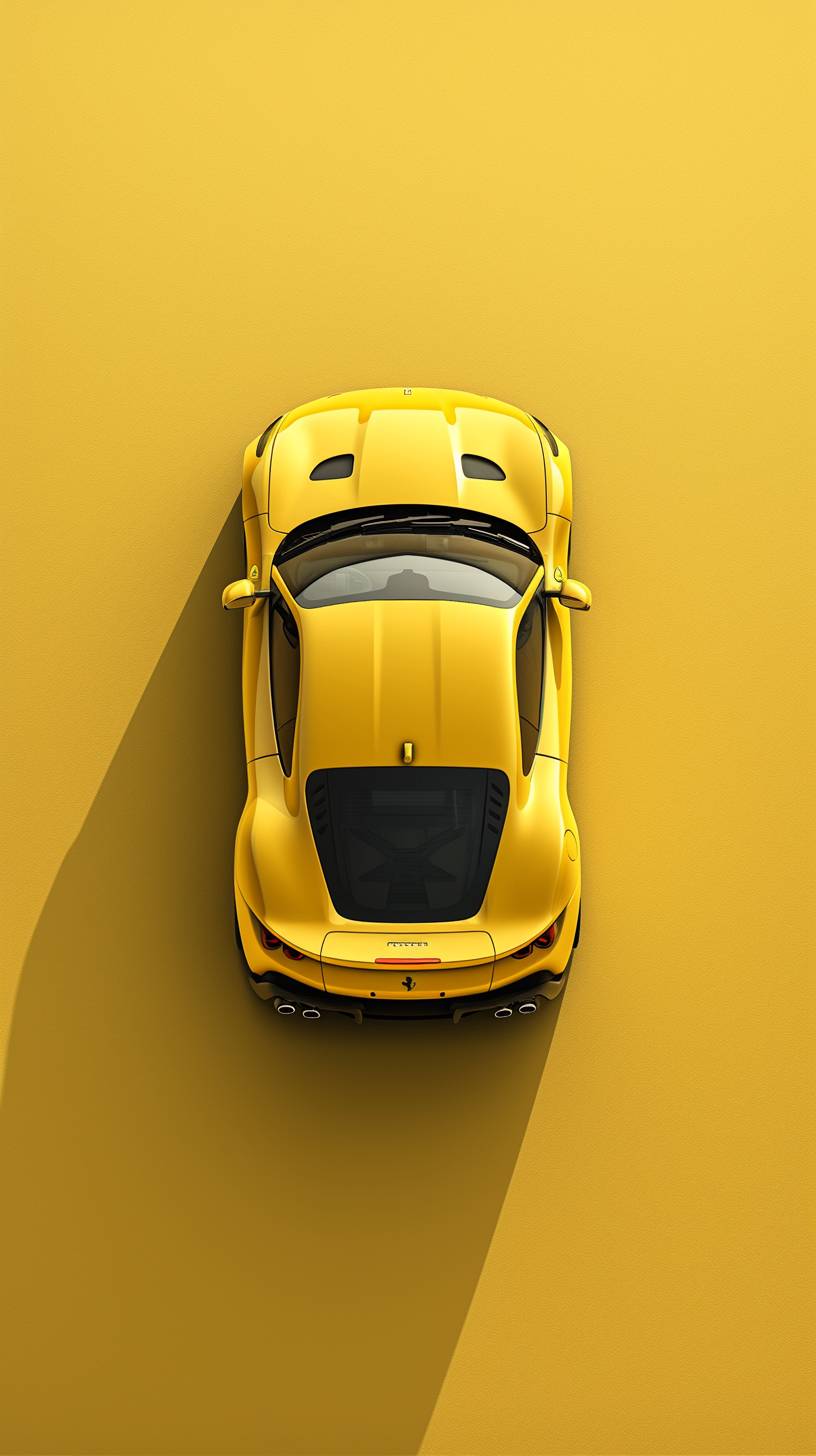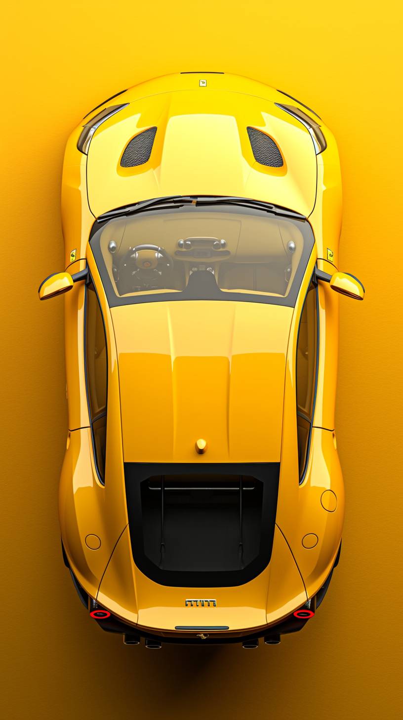從上方看到的法拉利羅馬玩具車,其比例小巧如微型機械玩具,細節豐富且低多邊形。車身顏色為黃色,無背景。設計應具有鮮豔的色彩,突出空氣動力學特徵,並且專為電子遊戲風格化,喚起收藏玩具車的感覺。