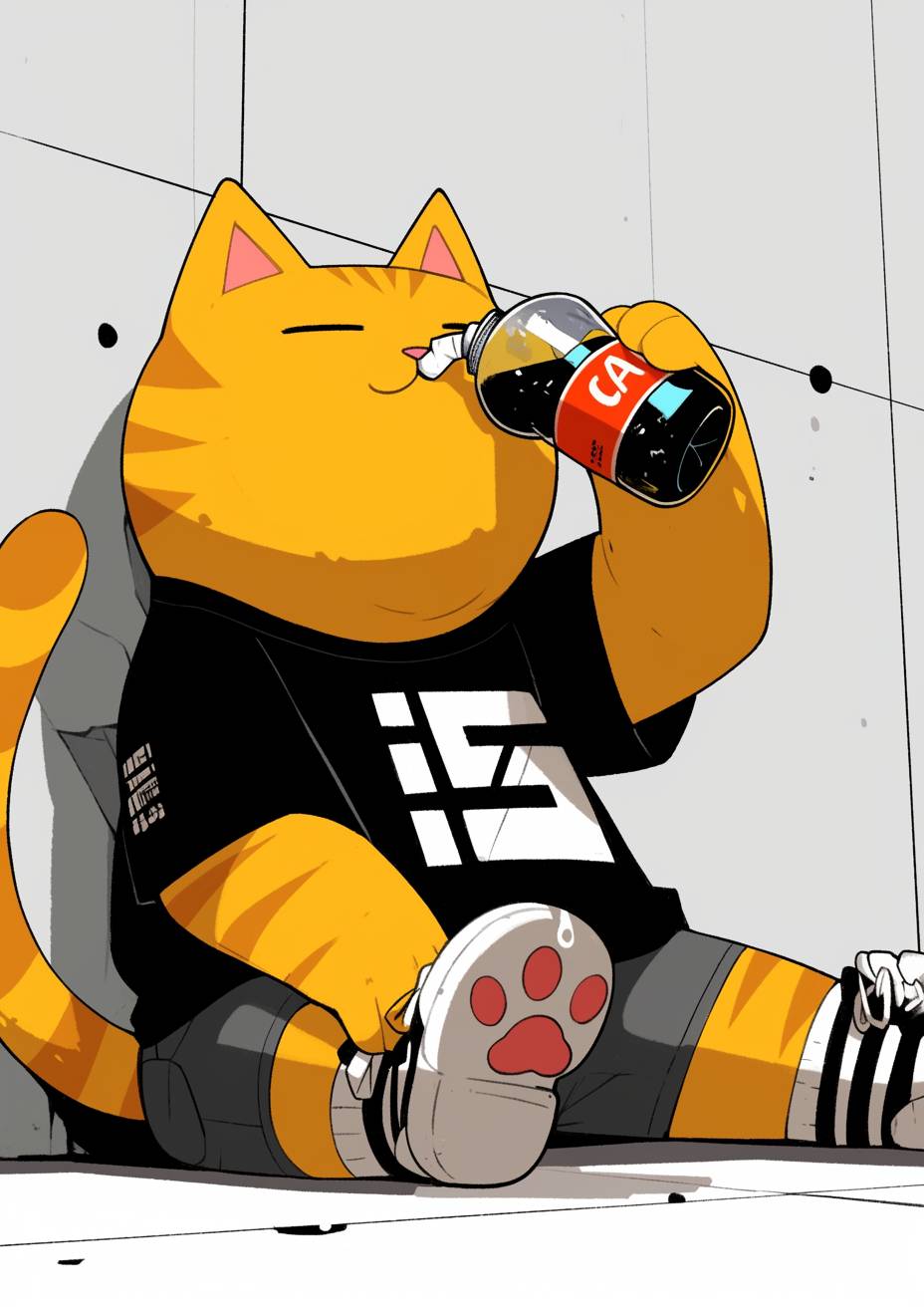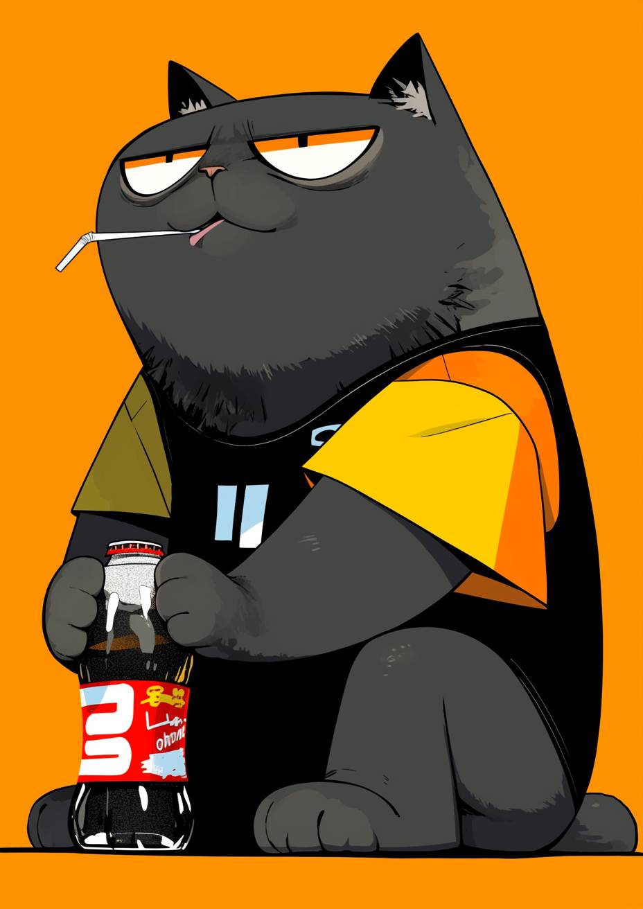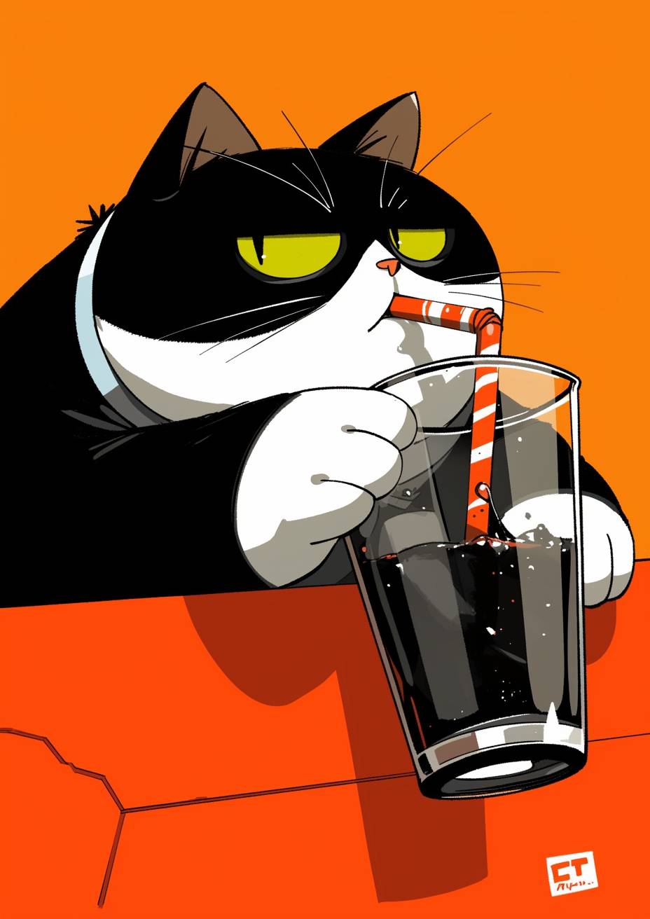 A fat cat is drinking cola. --sref 1131593691 --niji 6 --ar 5:7