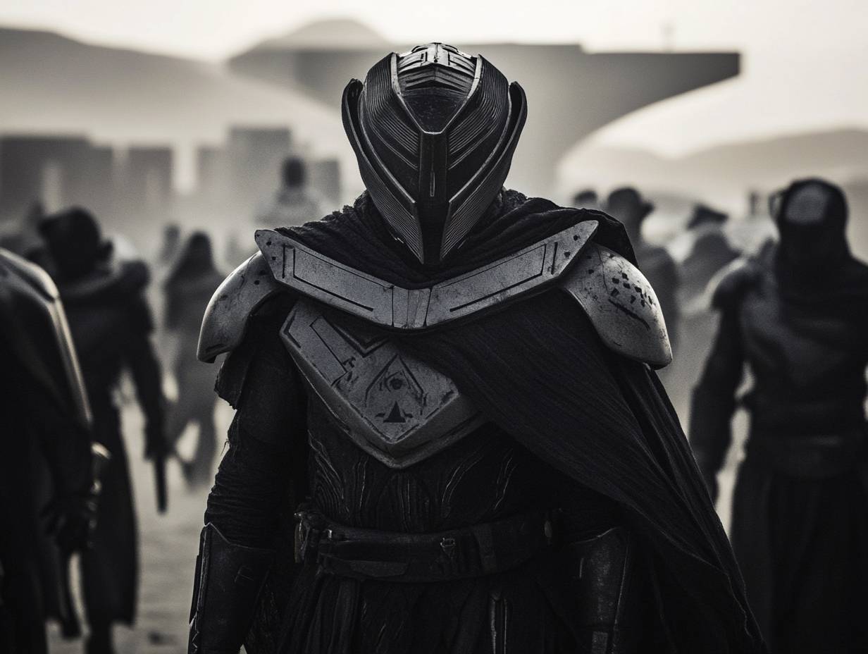 時尚肖像攝影,呈現重塑的《星際大戰》風暴兵,搭配現代都市服裝,中景,使用佳能EOS-1D X Mark III進行4K拍攝,磨砂效果,藍色單色工作室背景。