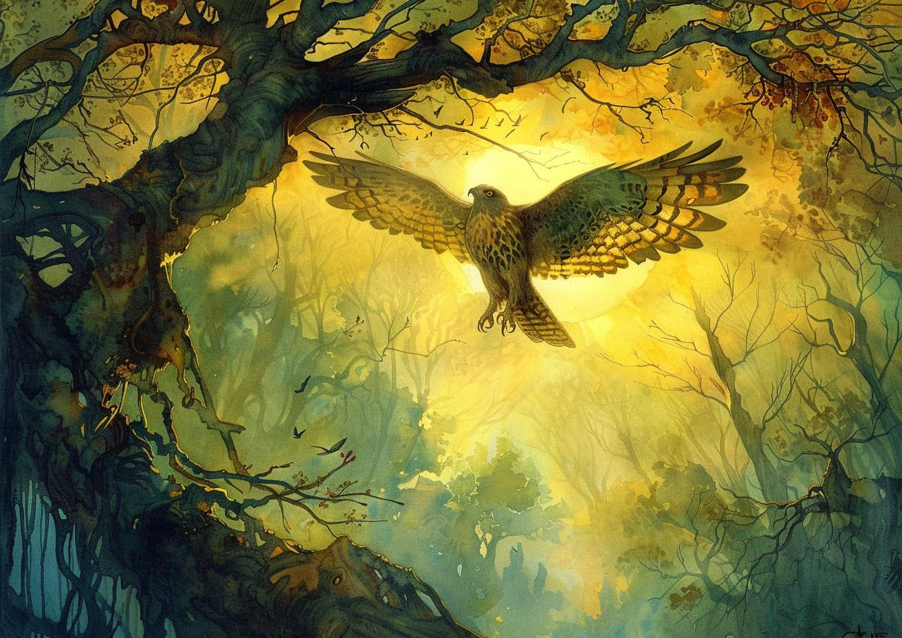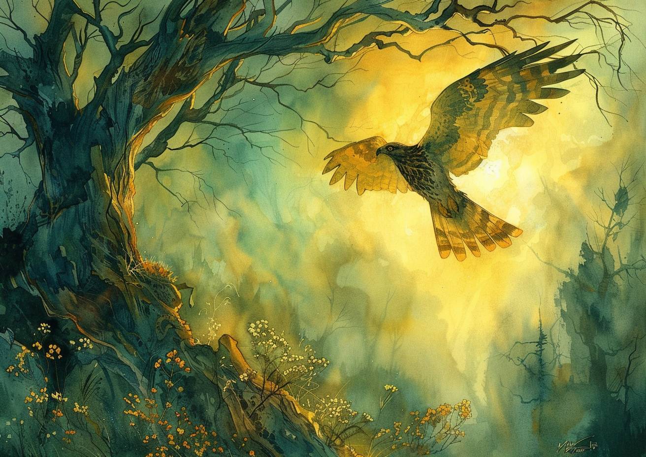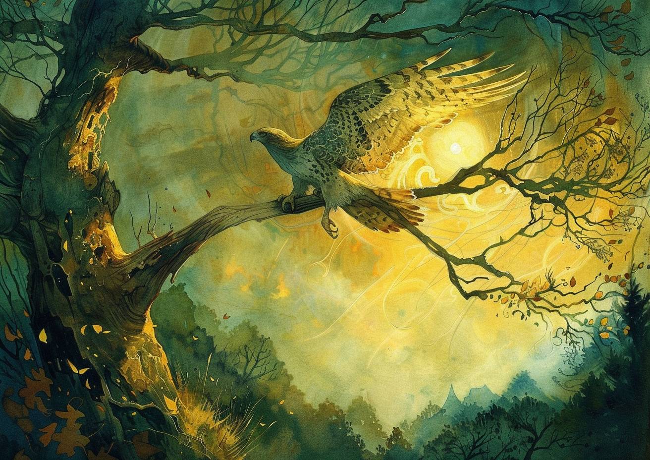 Apocalypsecore landscape, a hawk launches itself from a dead tree, wings strobing in the sunlight, strong visual flow --ar 7:5 --sref 2728983755 --stylize 250 --v 6.0