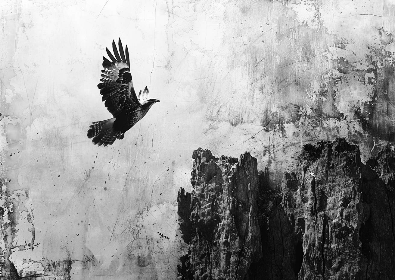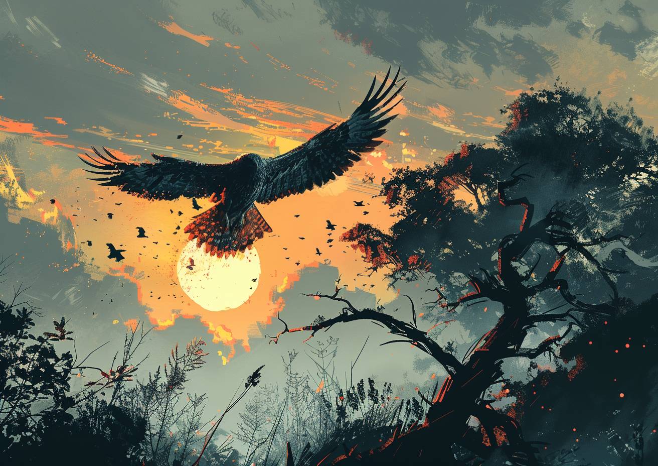 minimalist landscape, a hawk launches itself from a dead tree, wings strobing in the sunlight, Apocalypsecore --ar 7:5 --stylize 250 --v 6.0