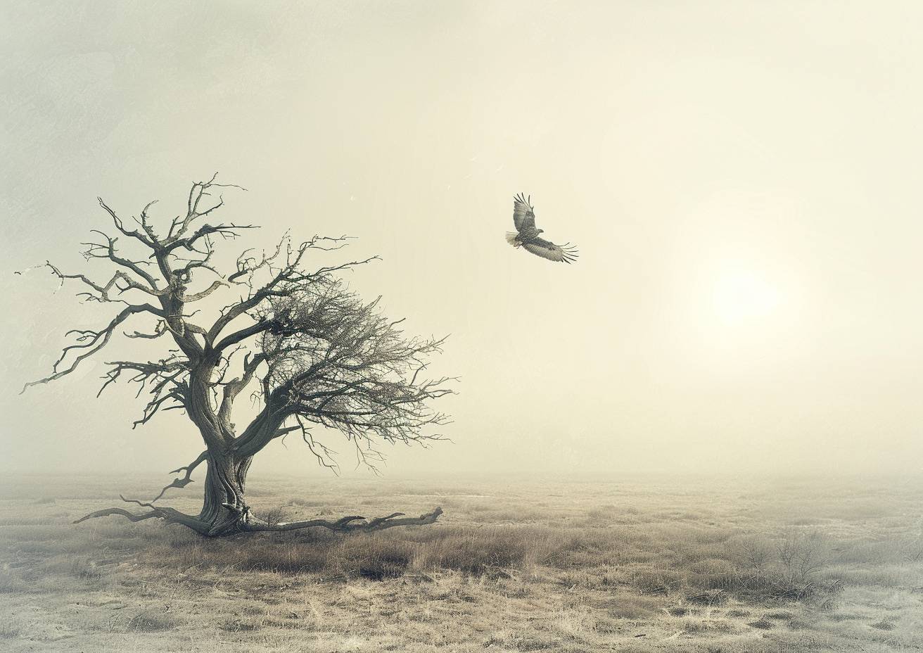 極簡主義風景,一隻鷹從一棵死樹上發起攻擊,翅膀在陽光下閃爍。