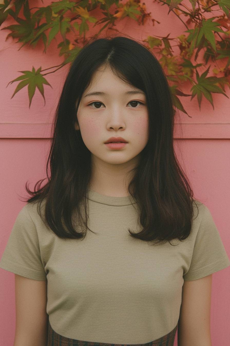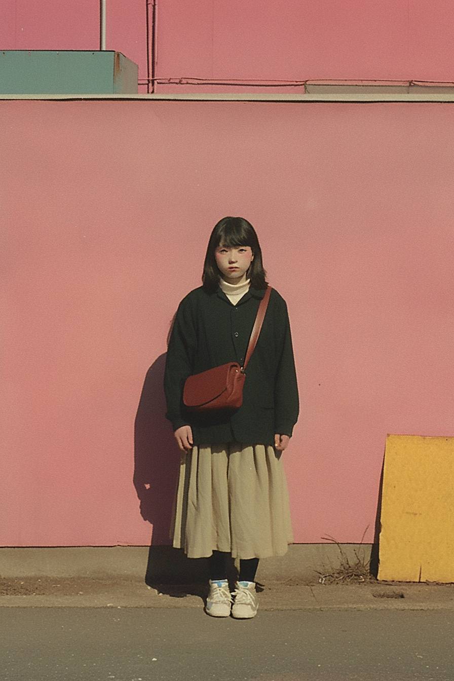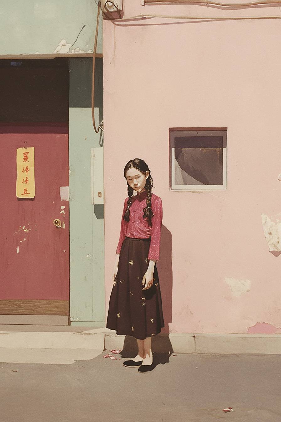 A young and beautiful Chinese girl is standing on the street. --sref 2446228844 --ar 2:3 --niji 6