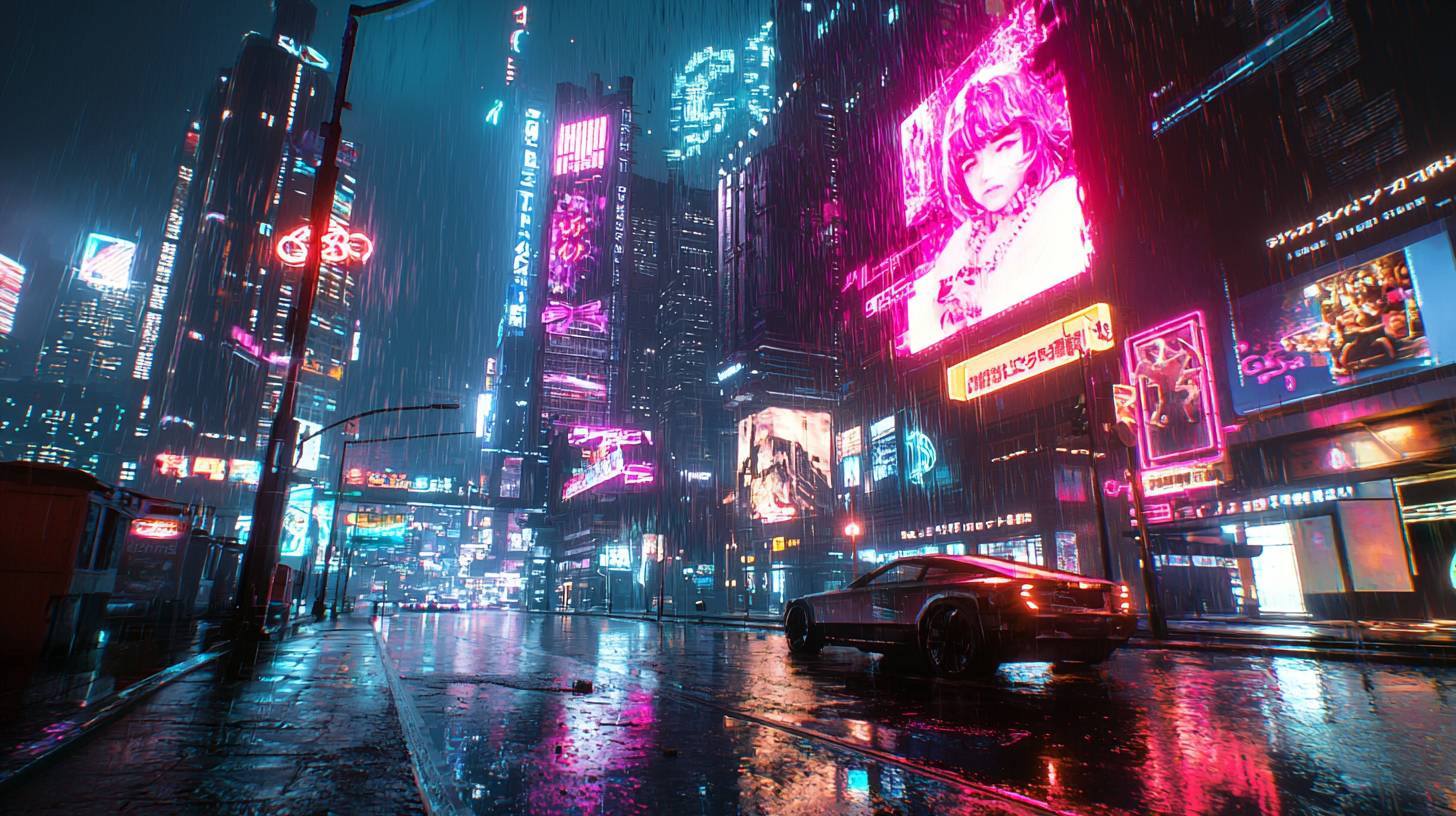 一個未來派的賽博朋克城市夜景,霓虹燈在濕漉漉的街道上反射,巨大的全息廣告牌,細節複雜,電影般的光線。