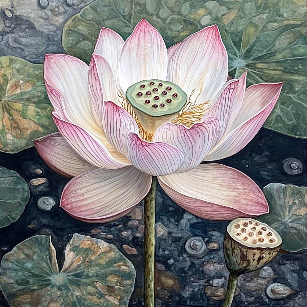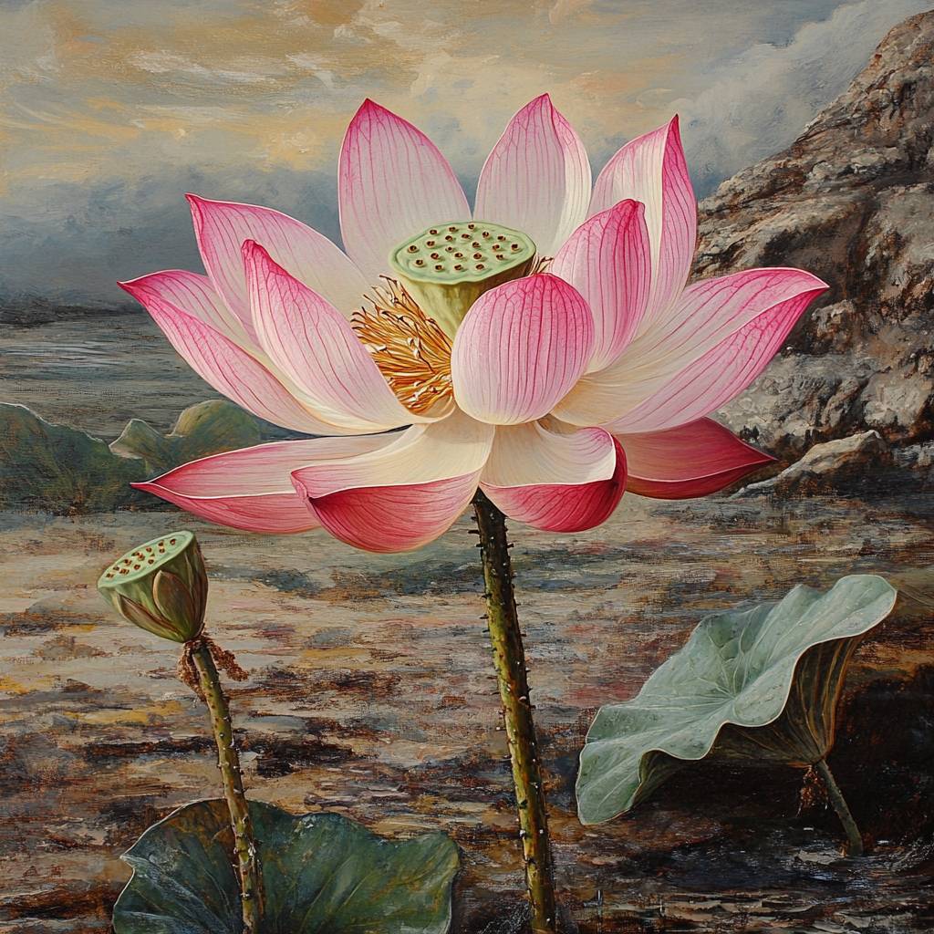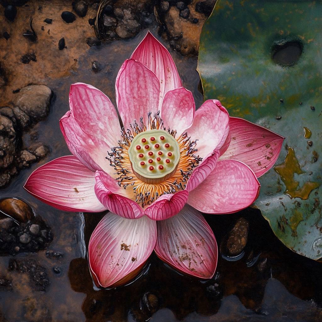 pink lotus flower coming out of mud into bloom with seed pod visible --v 6.1