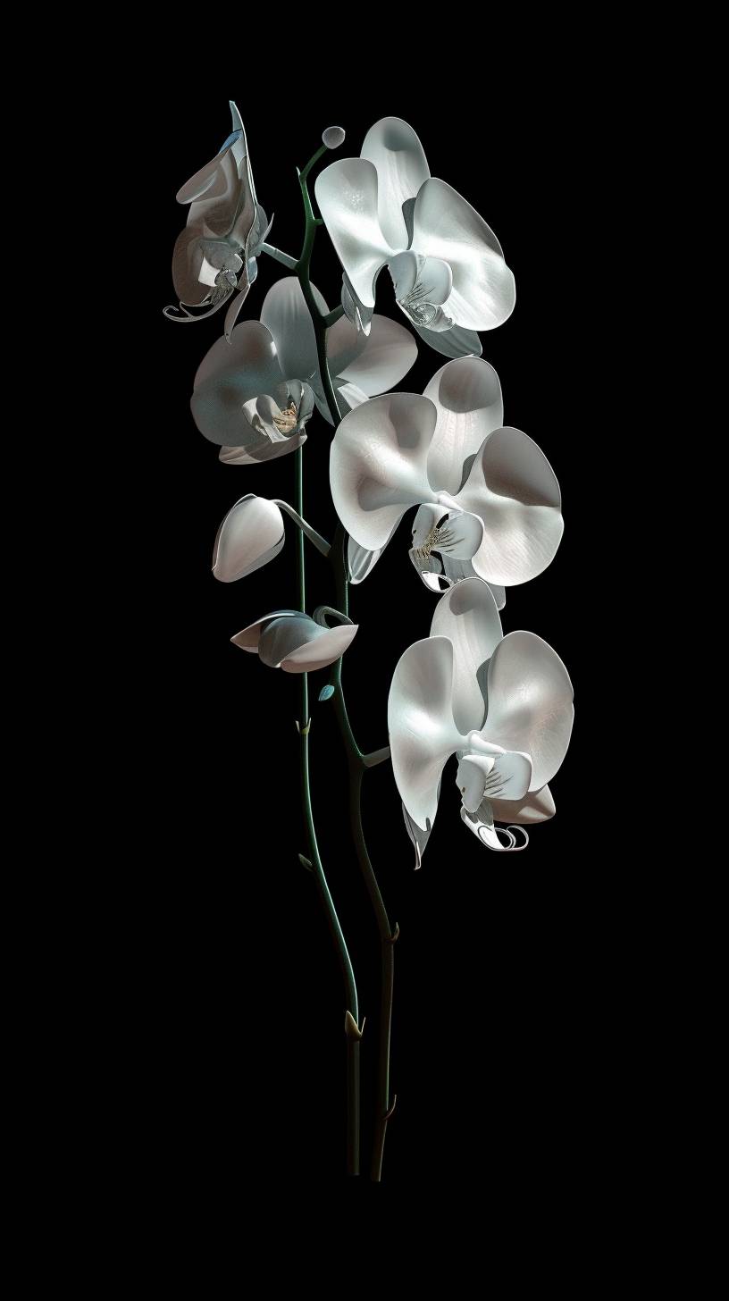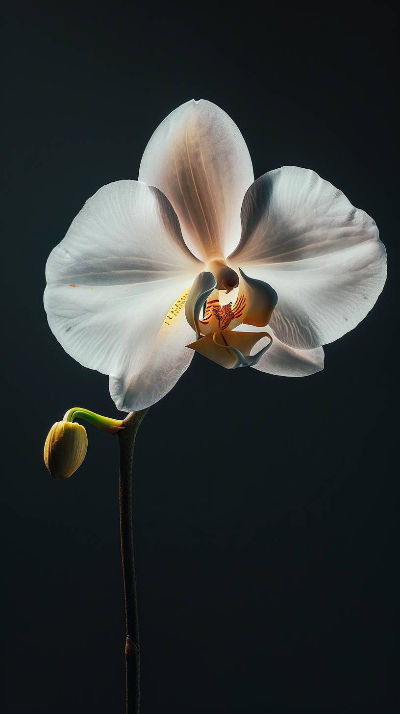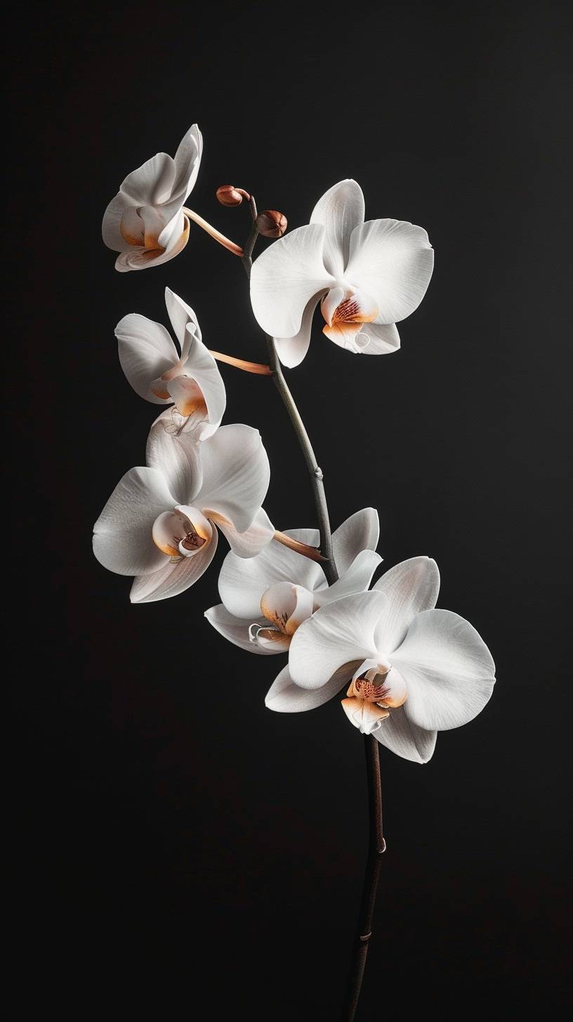 hyper realistic , ultra detailed white single orchid on a black background --ar 9:16 --v 6.0