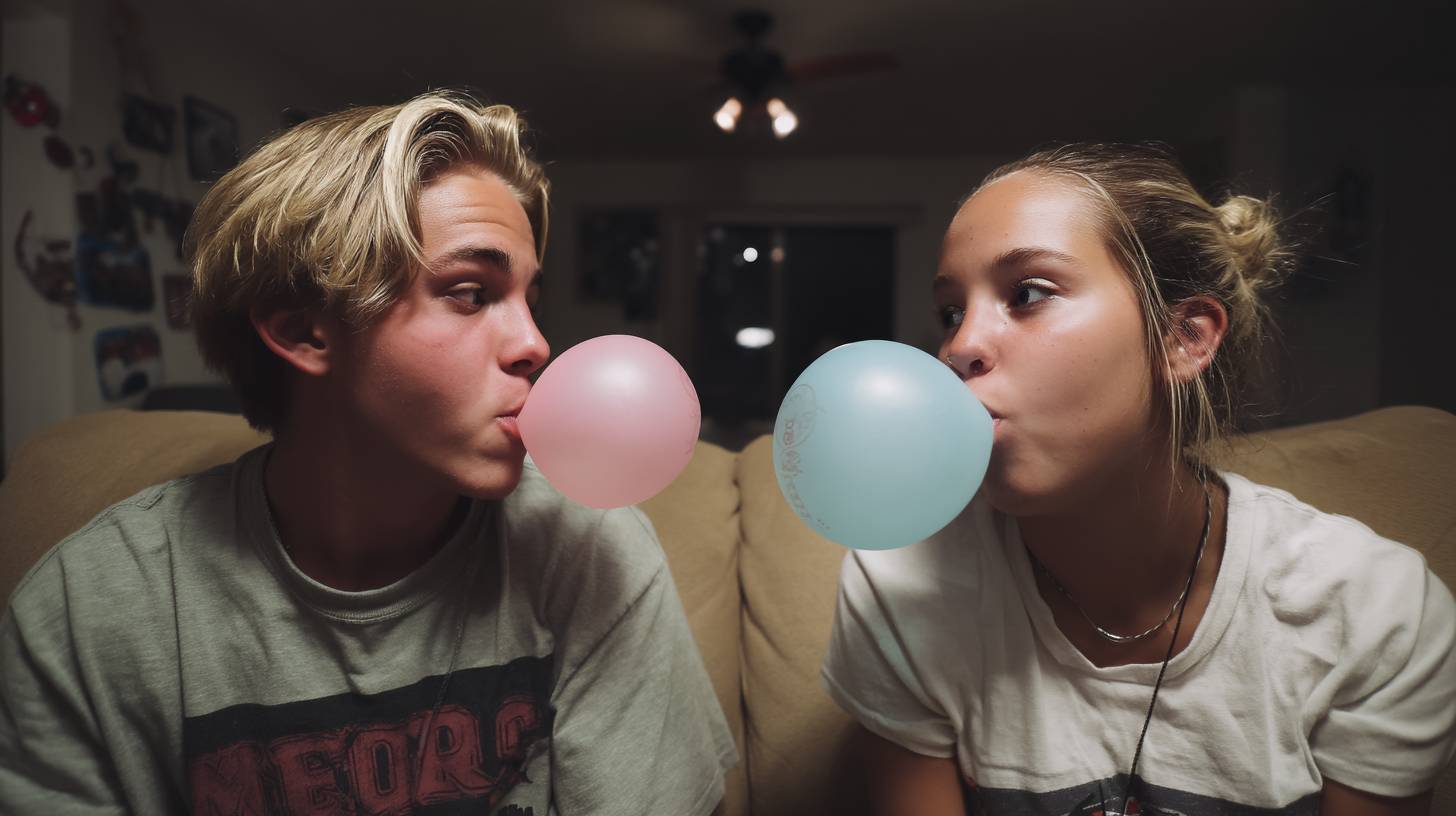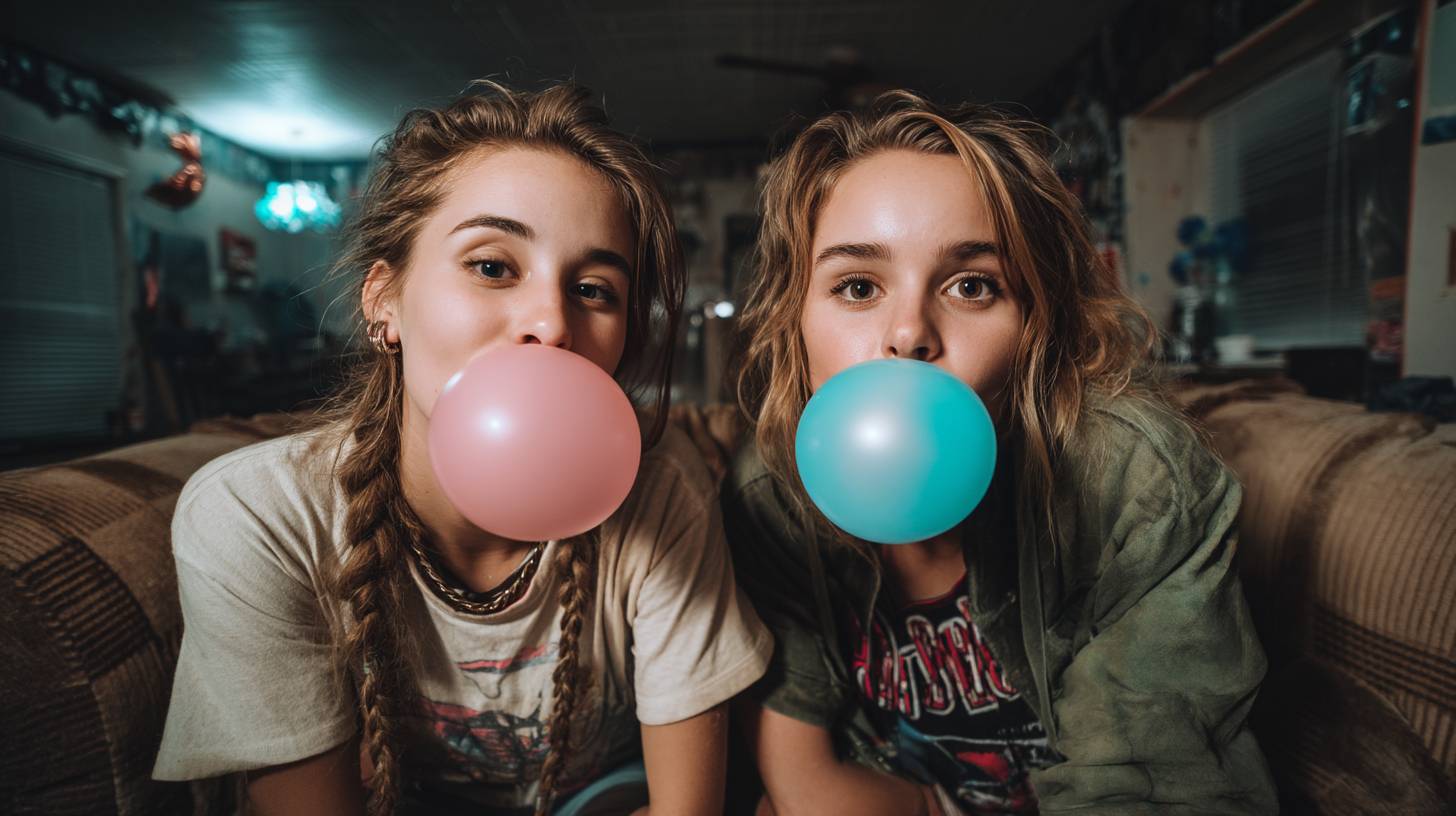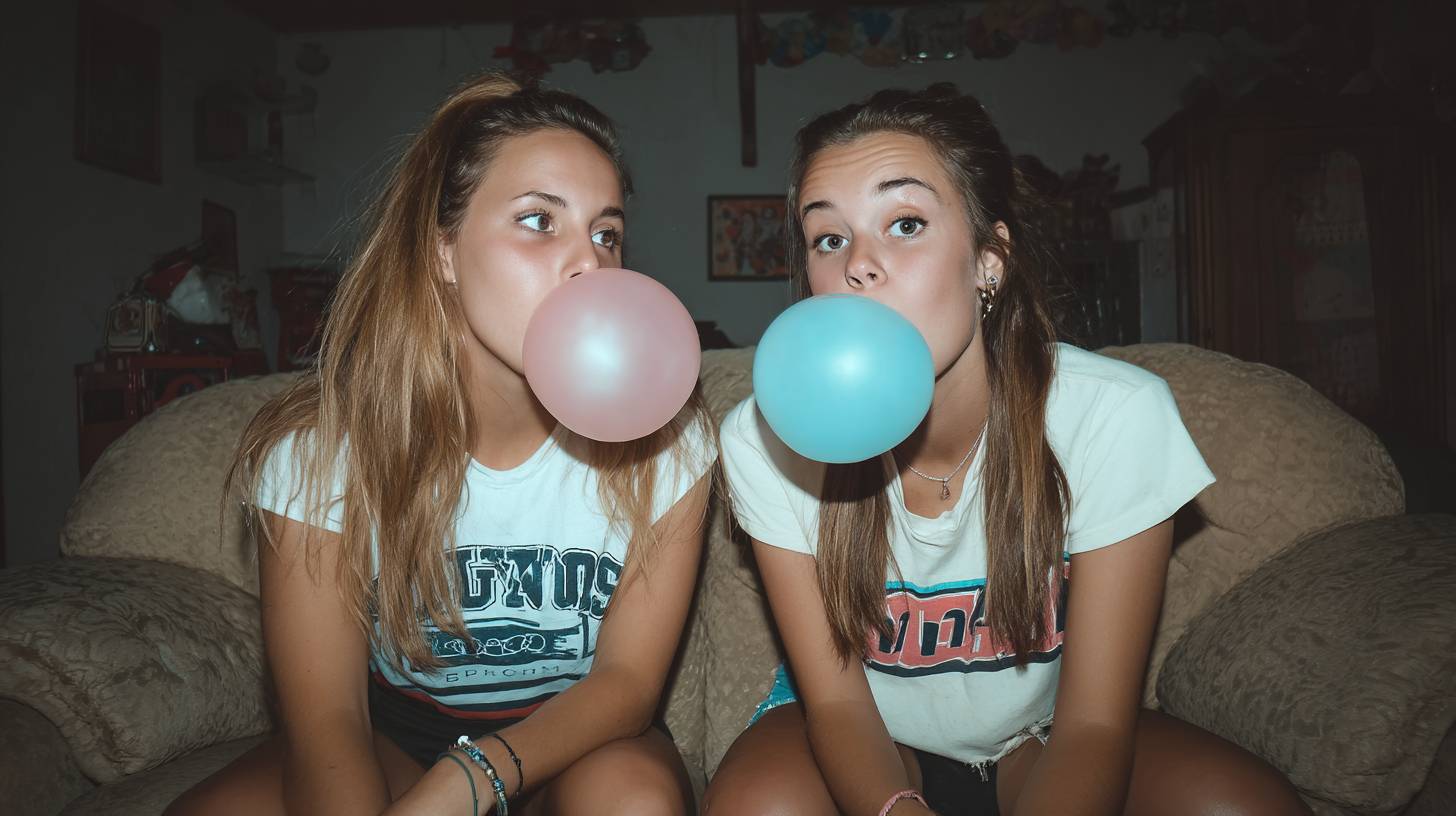兩名青少年坐在一張舊沙發上,在夜晚的家庭聚會中,面對面吹著大型泡泡糖氣球,一個粉色,一個藍色。他們玩味地互相看著,兩個大的泡泡在中央輕輕碰觸。表情充滿樂趣、青春和活力,捕捉了自發和調皮的瞬間。他們穿著休閒、時尚的街頭服飾,帶有90年代或復古風格的元素。房間燈光昏暗,環境光線極少,可能有一些分散的派對裝飾。照片使用直接的閃光燈拍攝,沒有擴散器,造成強烈的陰影和皮膚及衣服上的閃亮高光。相機設置:單反相機配35mm鏡頭,光圈f/8,ISO 200,快門速度1/125秒。美學呈現生動而編輯,低對比度的外觀和略顯飽和的色調,除了泡泡糖氣球看起來明亮而鮮豔。靈感來自90年代的狗仔風格時尚攝影和即興的派對時刻。