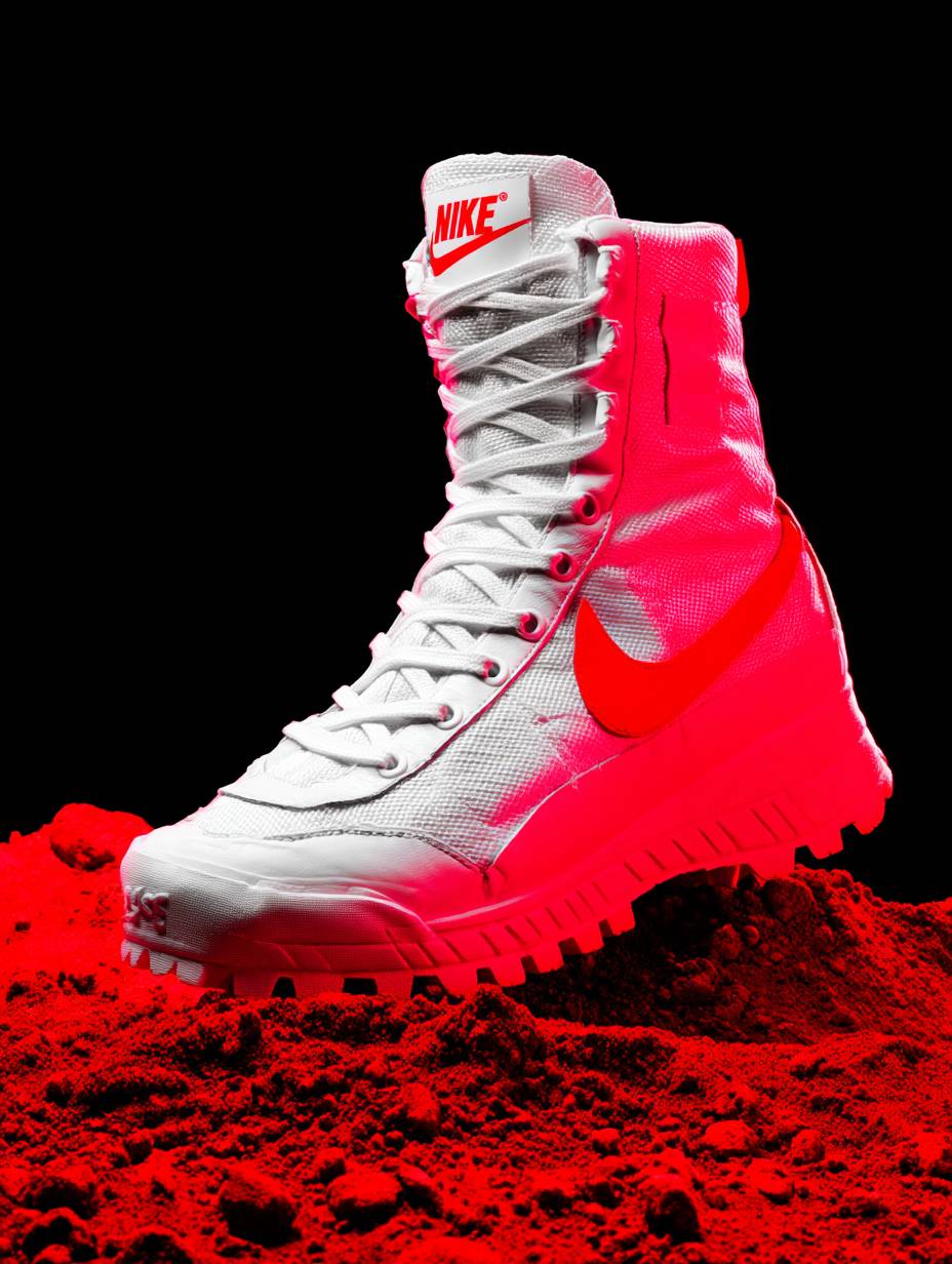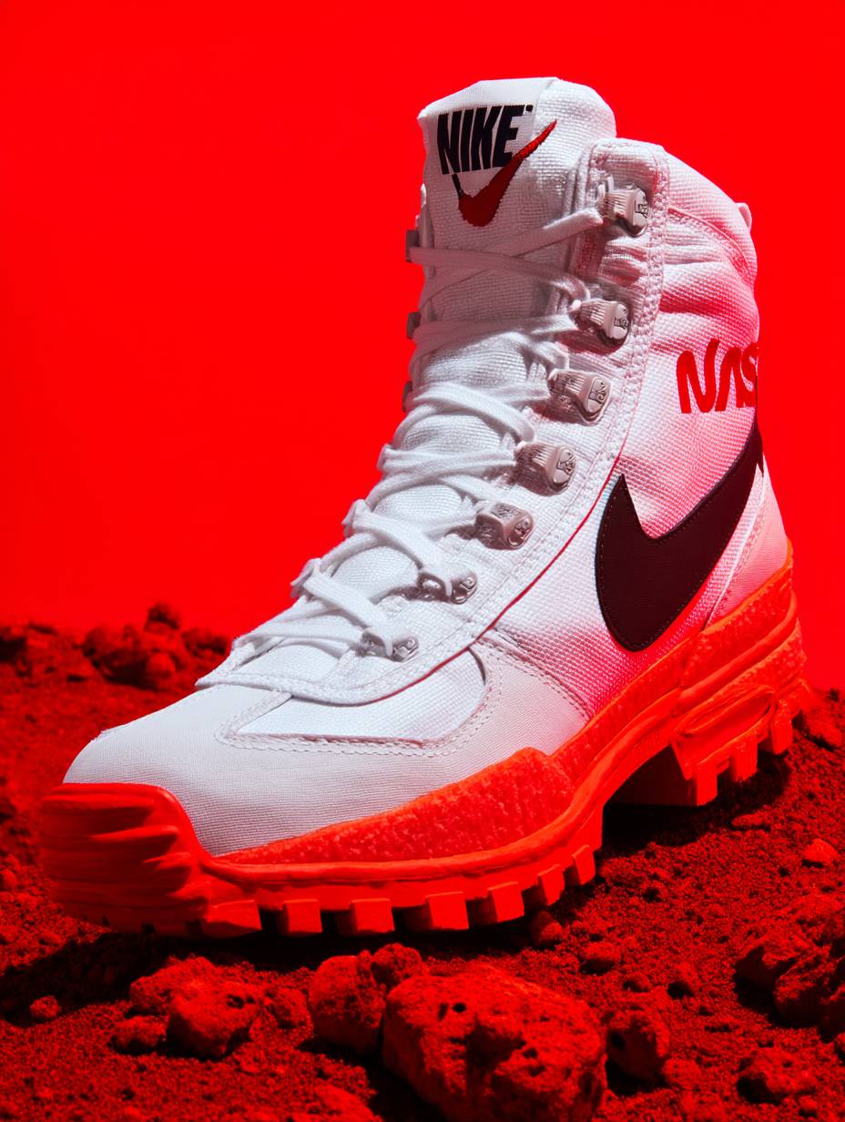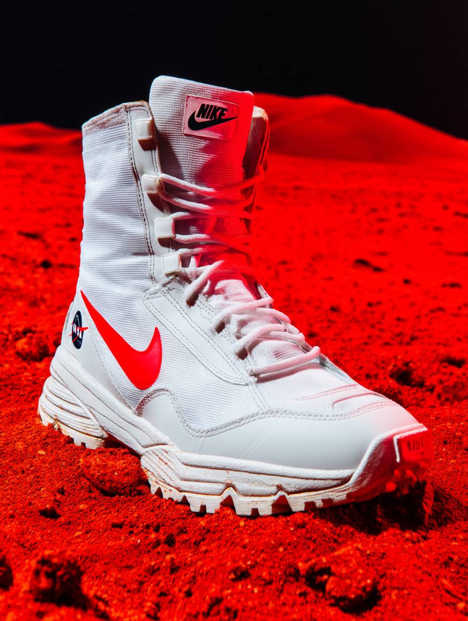 White Nike astronaut Mars boot, Mars landing space theme, Nike logo in boot, editorial, Nasa logo in boot --chaos 10 --ar 3:4 --profile ecxgynn --stylize 355 --v 7.0 --raw