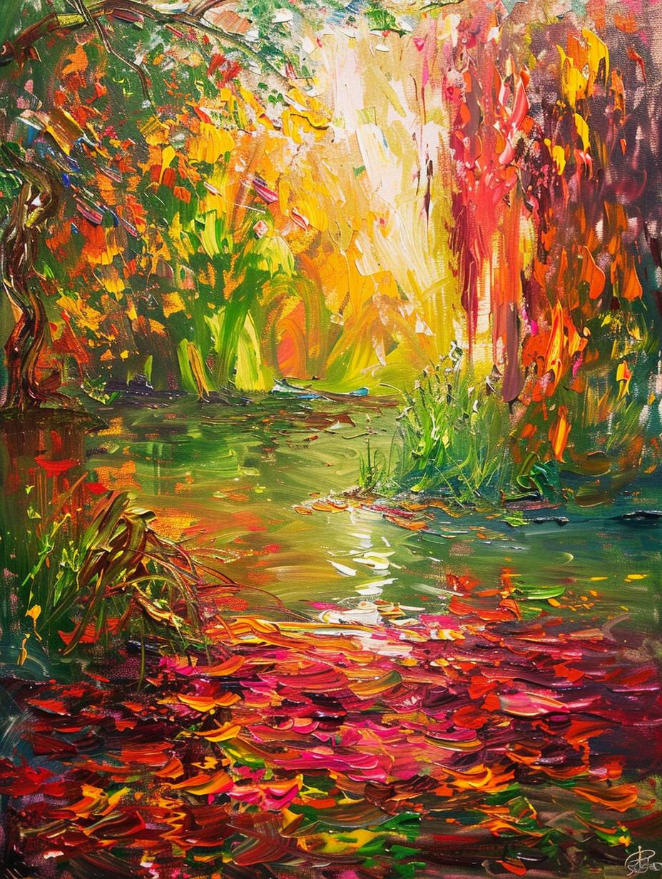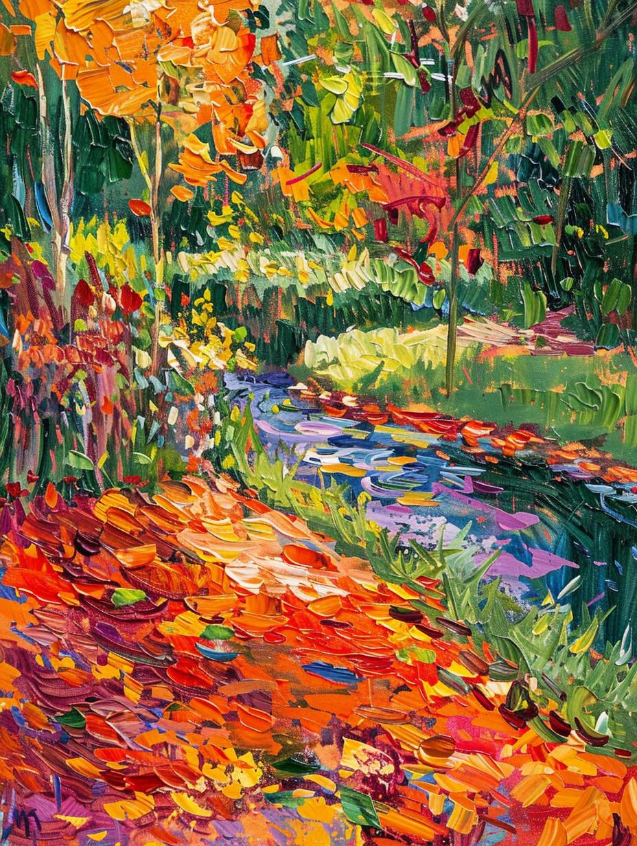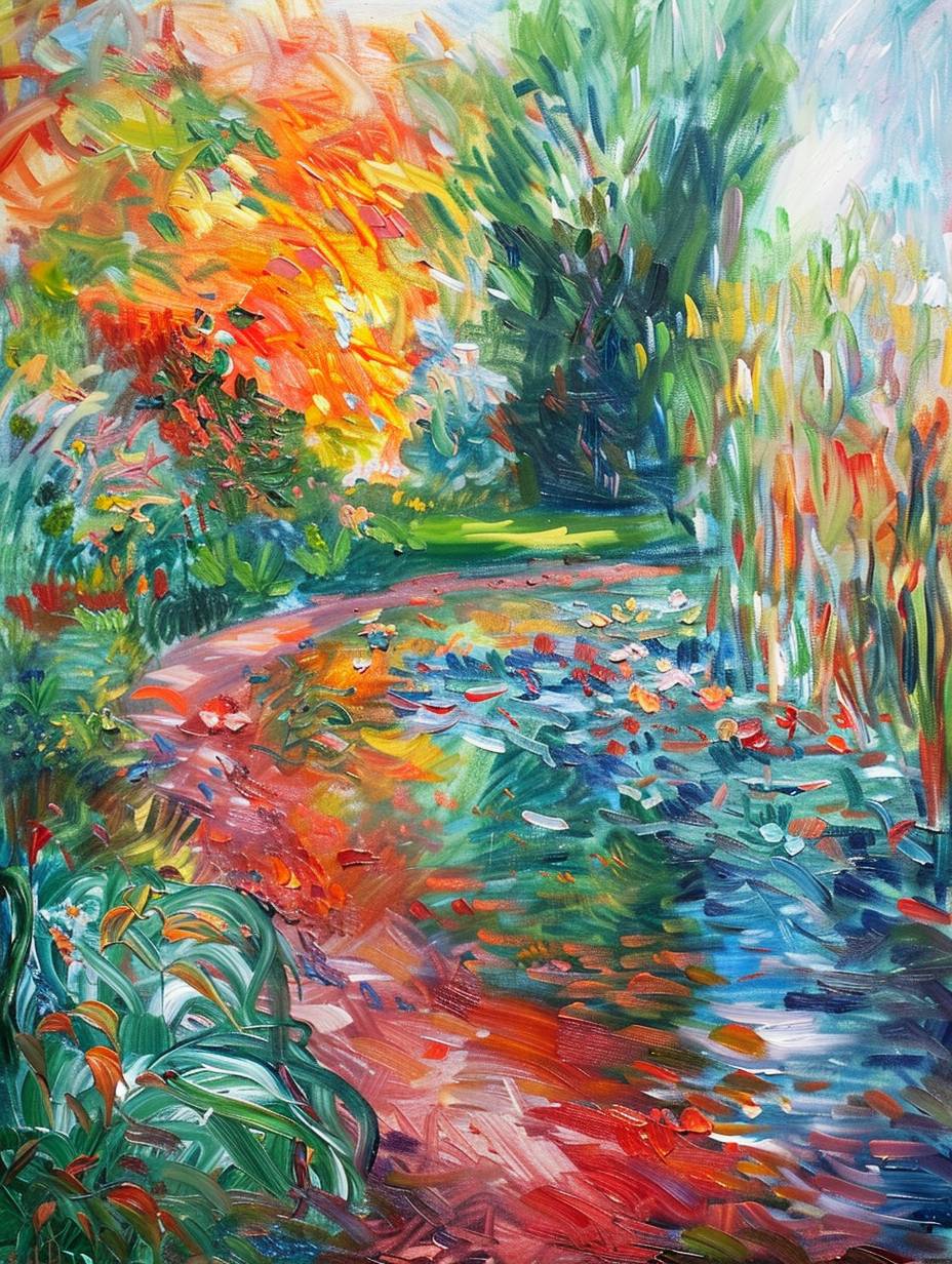 這是一幅秋天的印象派風格畫作,描繪了充滿活力的花園,生機勃勃的綠草和樹木,紅色的土地上覆蓋著橙色的樹葉,以及水面上的光影倒影。