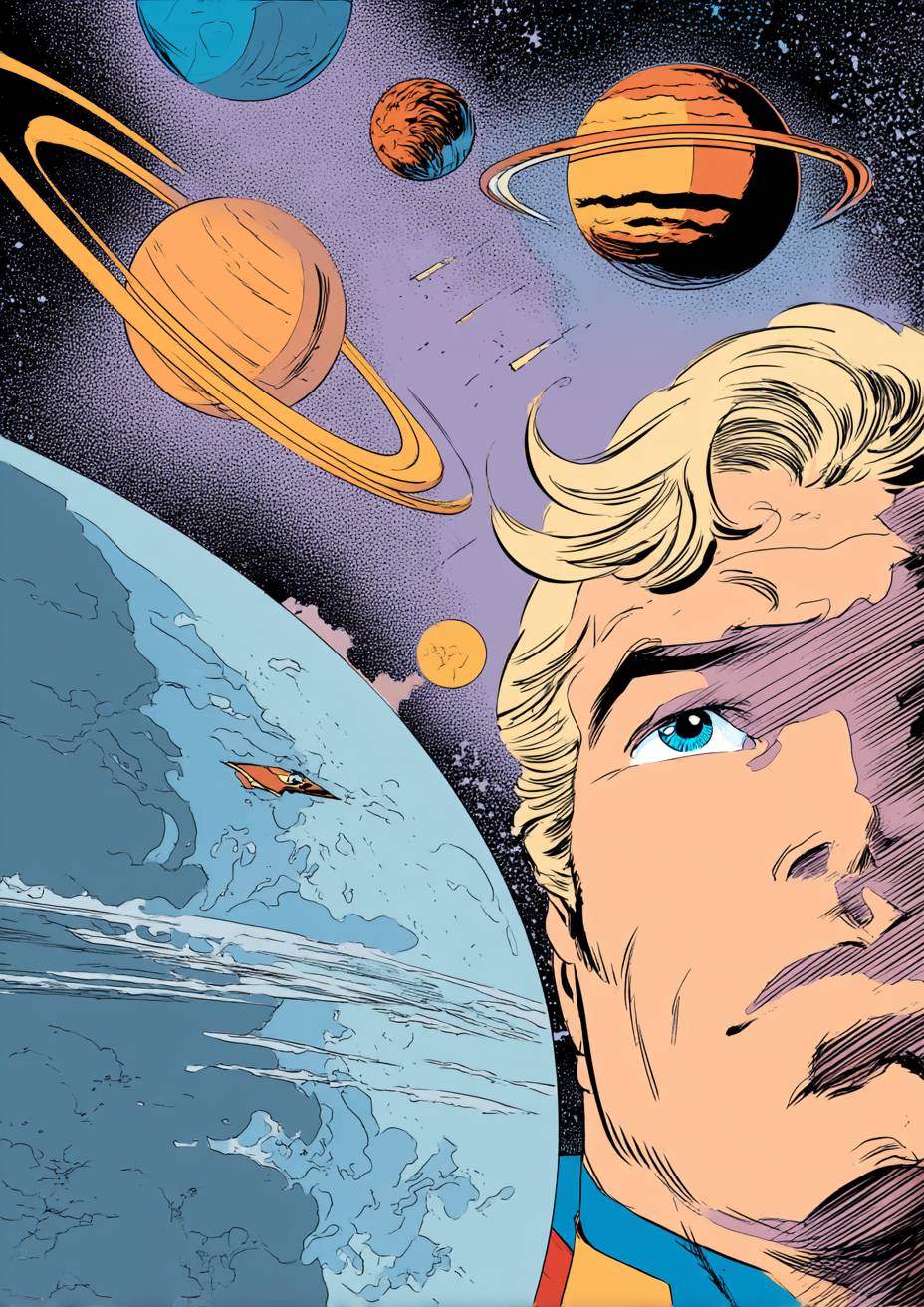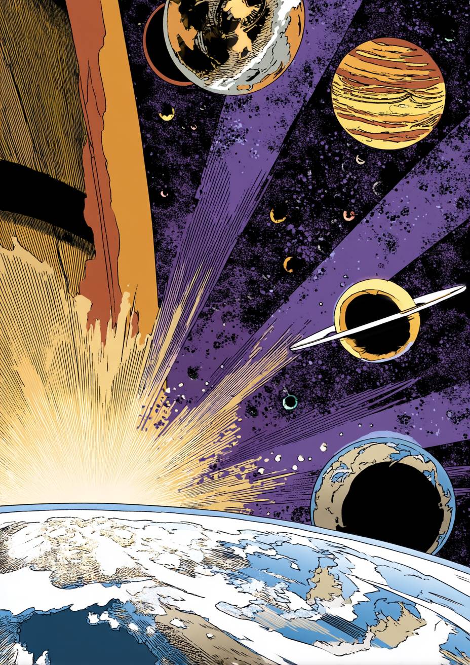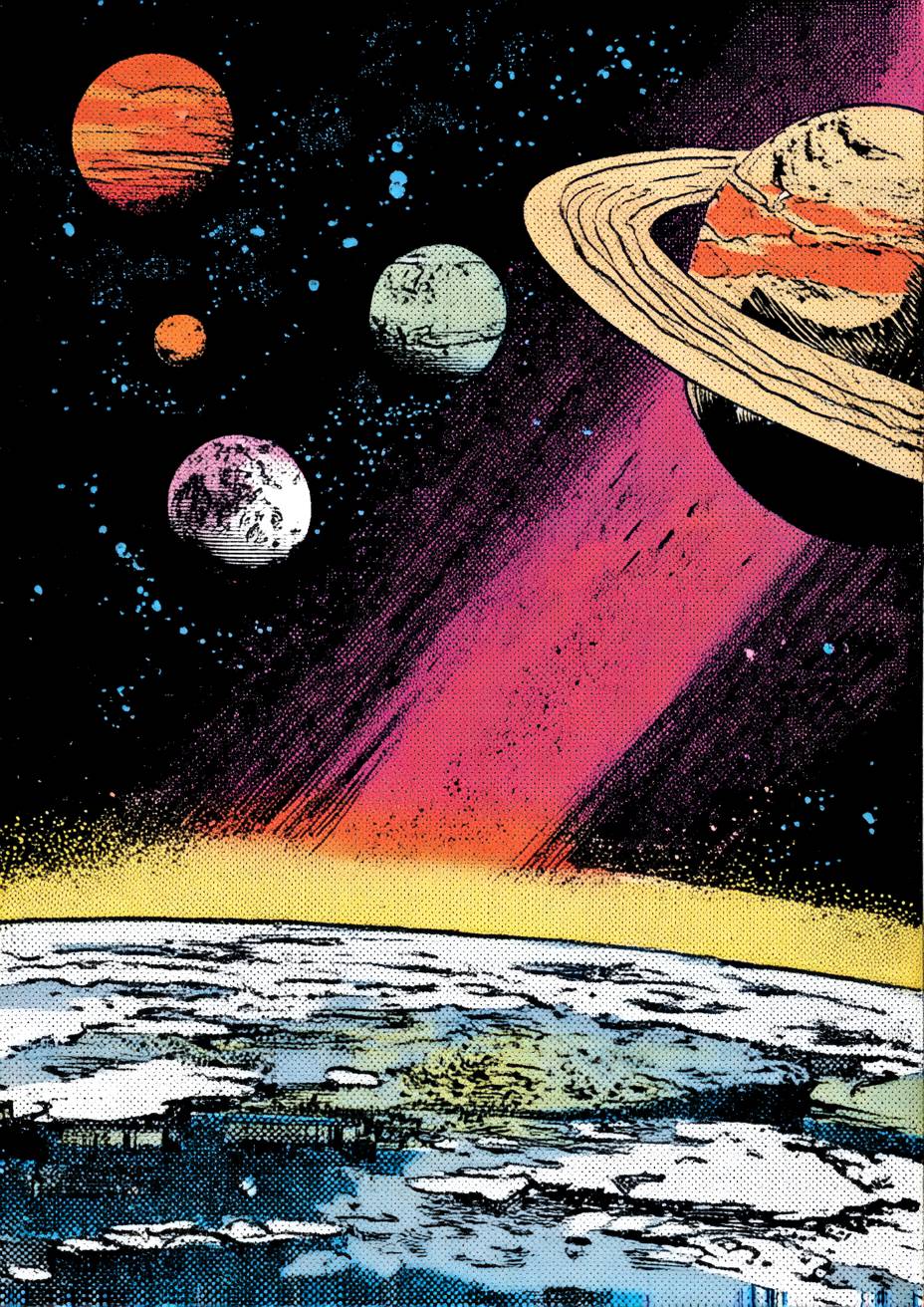 A 70's comic book cover in style of DC comic drawing with strong outlines. an earth quarter in left side with pov from atmosphere scene cosmic space with moon, saturn and jupiter behind. --ar 5:7 --v 7.0 --s 50