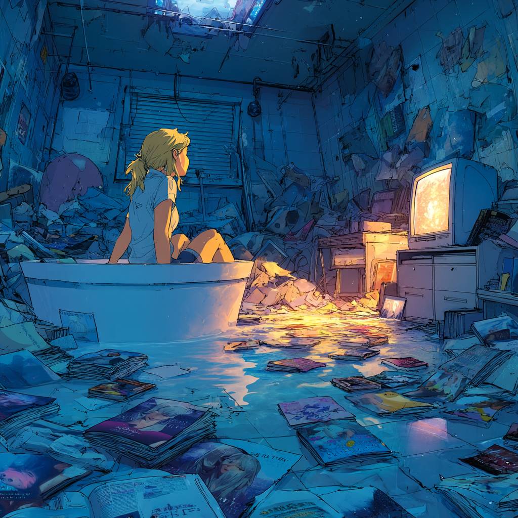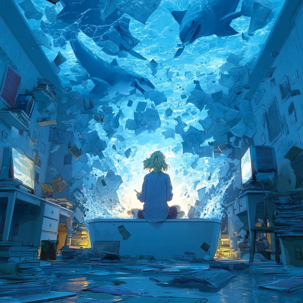 一個女孩坐在浴缸裡,周圍是電腦、鯊魚和漫畫書的混亂場景。