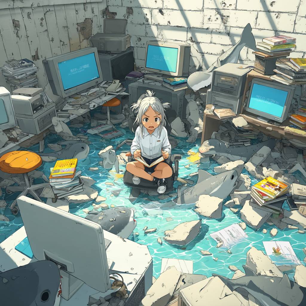 an anime scene, pure chaos, a girl sitting in a tub, computers, sharks, manga books ar 16:10 --stylize 250 --v 7.0
