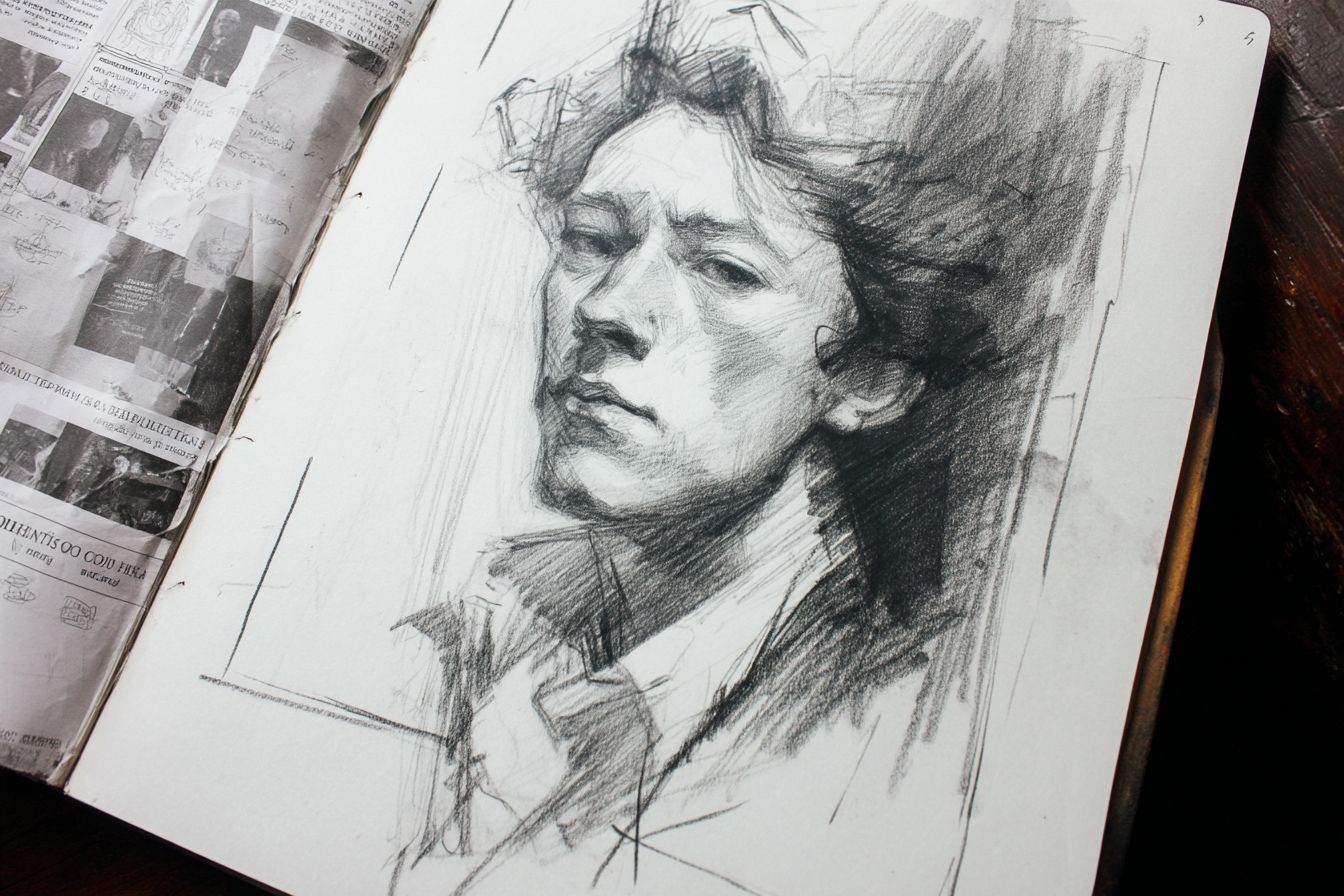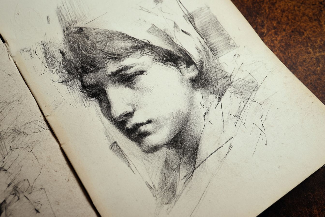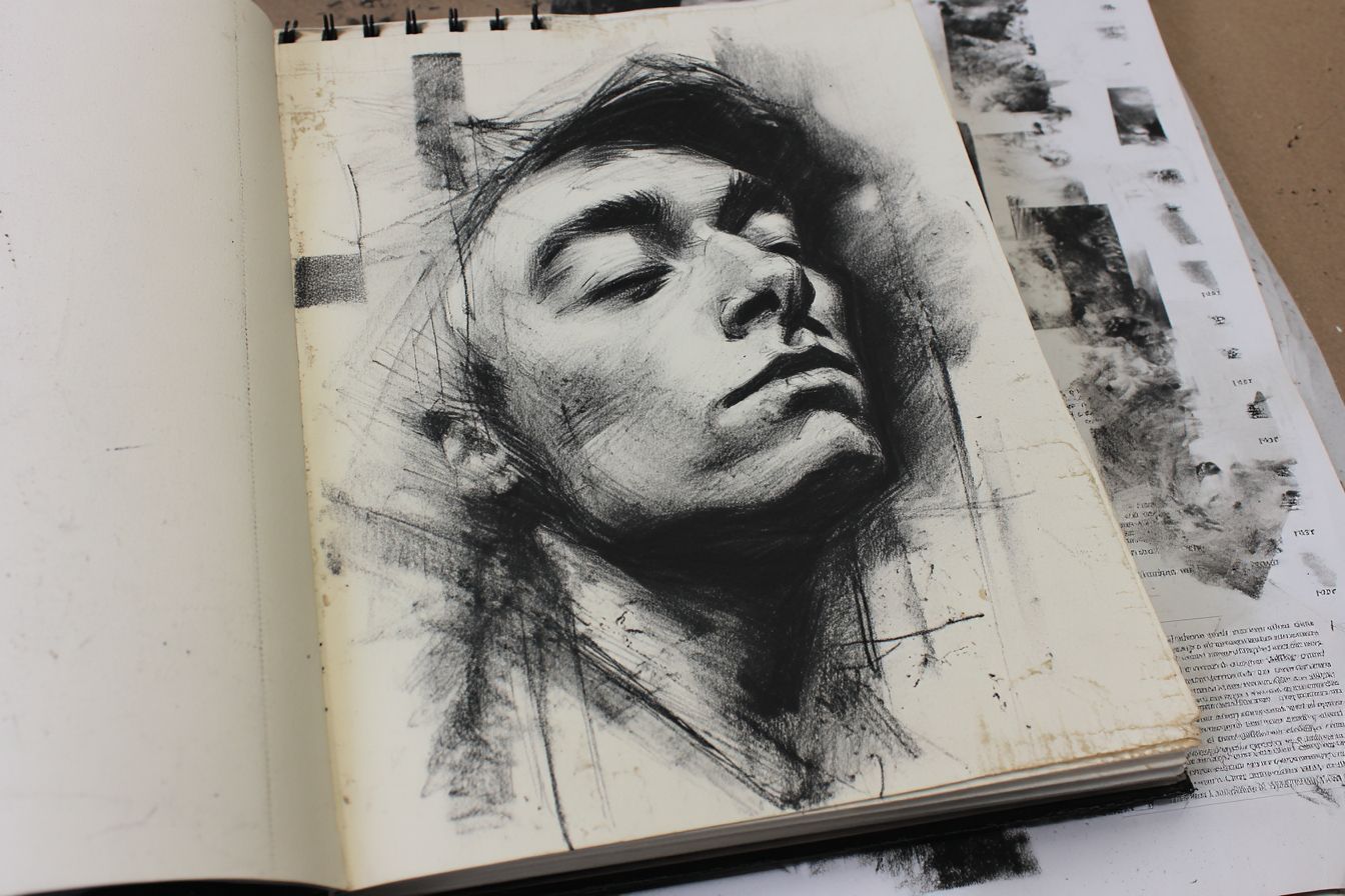 一幅炭筆素描,展現生動的陰影和大膽的線條,背景有模糊漸變和素描書標記,展現出粗糙而優雅的風格。