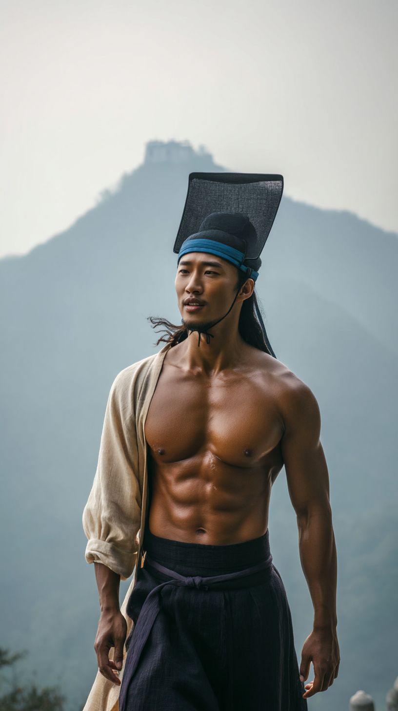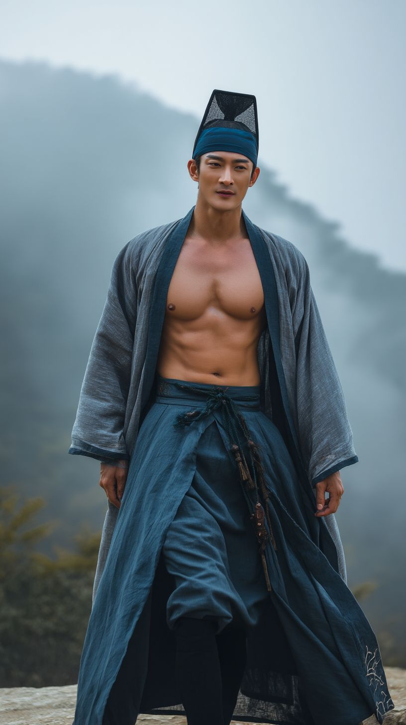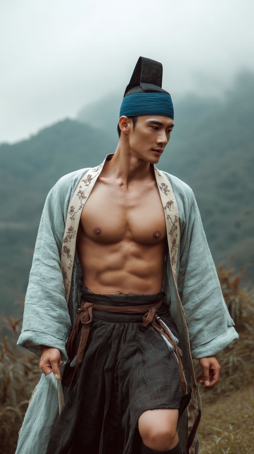 一名25歲的中國男子,穿著傳統的中國明代漢服,戴著古代的官帽。他額頭上的細藍色髮帶在風中飄動,身材高大英俊,膚色黝黑,比例勻稱。漢服開襟,可以看到胸部和腹部的毛髮。他穿著帶背帶的男士套裝和黑色襪子,腿部肌肉非常明顯,身高1.85米。在山中行走,遠處山霧繚繞。浮世繪風格,超高清質量。