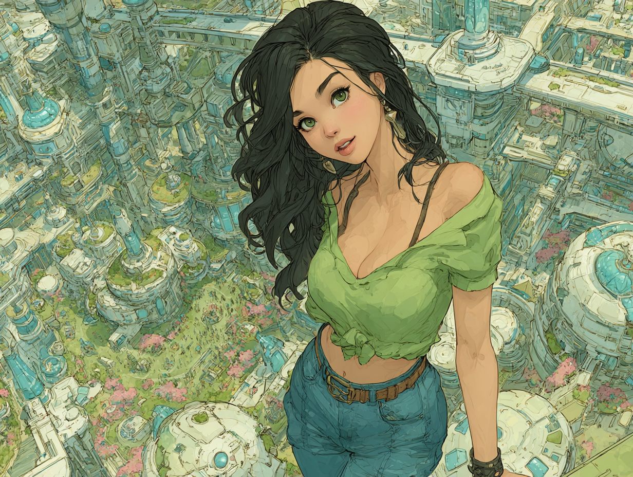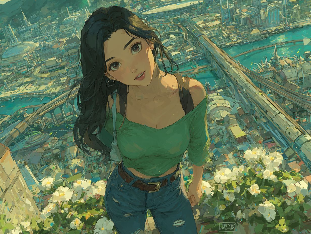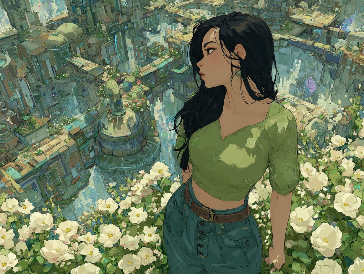 The great goddess Loreley is a korean looking woman, the supreme siren mythological figure in jeans and a greenshirt and long black hair overlooking a large futurustic city of flowers and steel --ar 4:3 --raw --stylize 500 --v 7.0