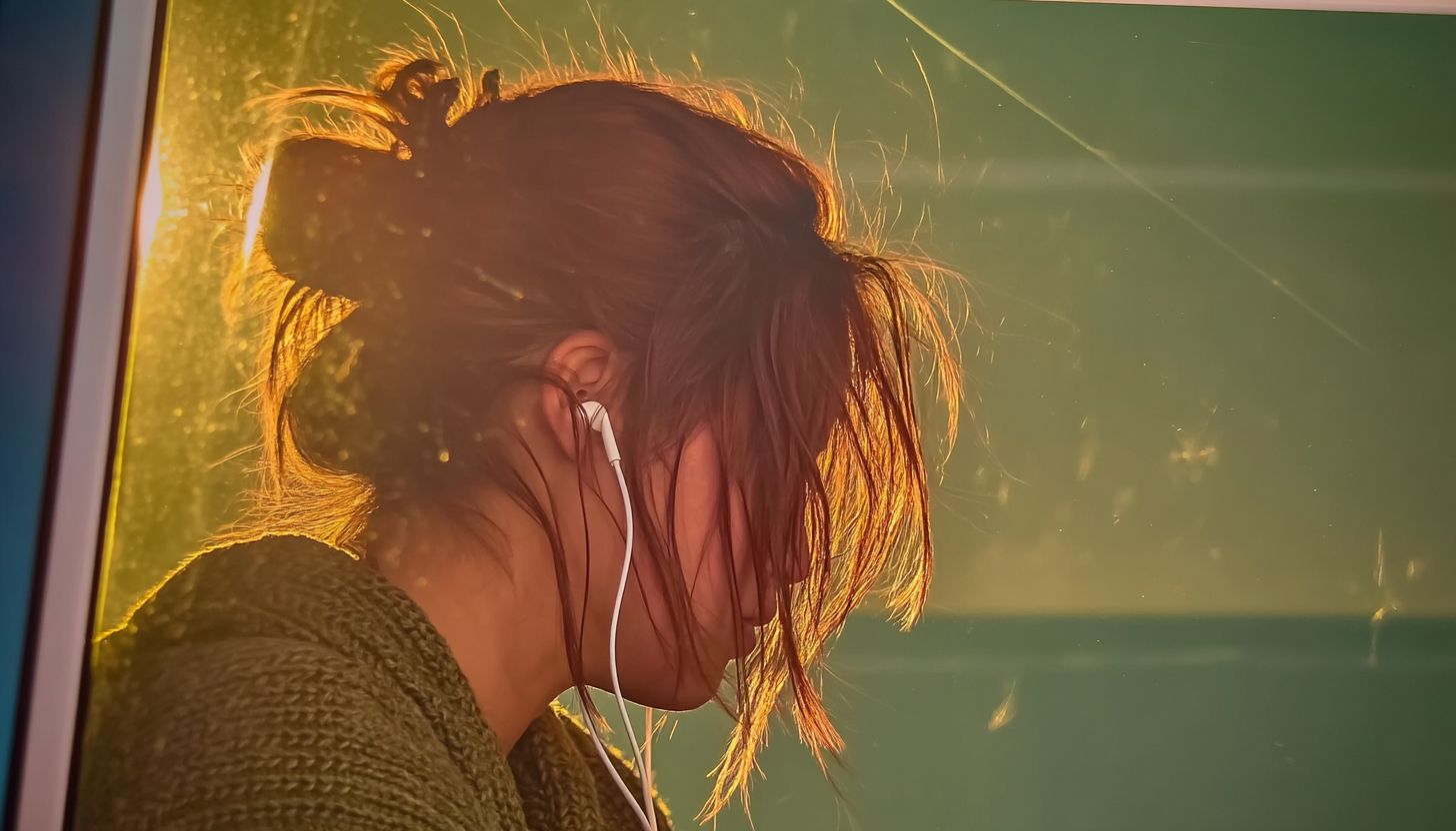 hyperrealistic photo of a girl, hair covering her face, white headphone wire lists down from her ears, she's leaning her head against a car window, a sunbeam falls on her face, golden hour, wide shot , rule of thirds, dreamlike framing --profile a42yza3 eh2uxh3 --v 7.0 --ar 7:4 --s 250 --raw