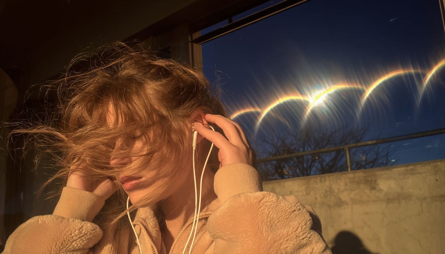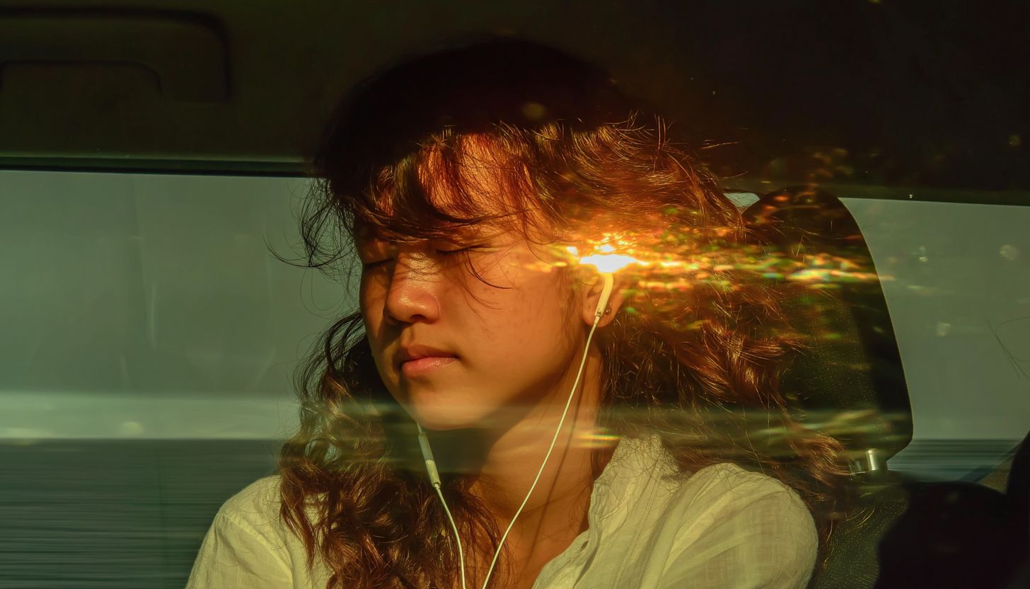 一張超現實主義的照片,女孩的頭髮遮住了她的臉,白色耳機的線垂下來,從她的耳朵上流出。她將頭靠在車窗上,一束陽光照在她的臉上,正是黃金時段,廣角拍攝,遵循三分法則,夢幻般的構圖。