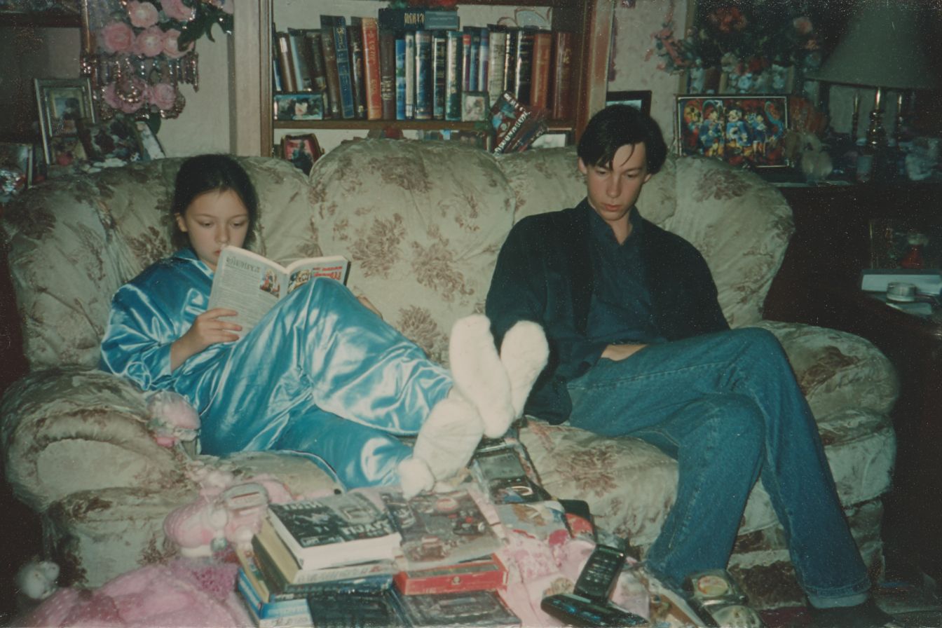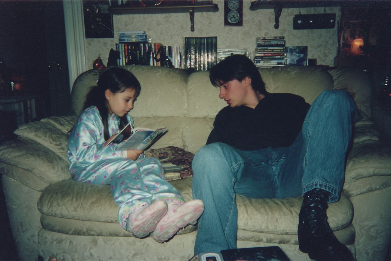 A young girl in blue pajamas with her feet up on the sofa, reading a book next to a man in his early twenties wearing jeans and a shirt with black hair. The room is decorated as if it's from late 1990s in London. Photo taken with a home camera phone, in the style of early 35mm film --ar 3:2 --v 7.0 --p qbktiqd
