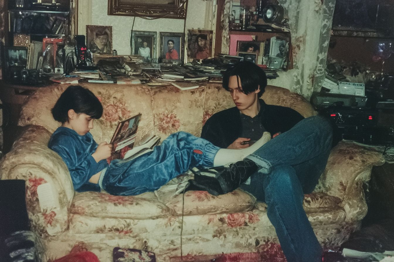 一名穿著藍色睡衣的小女孩,腳搭在沙發上,正閱讀一本書,旁邊坐著一位二十多歲的年輕男子,他穿著牛仔褲和襯衫,黑髮。房間的裝飾彷彿來自1990年代末的倫敦。這是用家庭攝影手機拍攝的照片,呈現出早期35毫米膠卷的風格。
