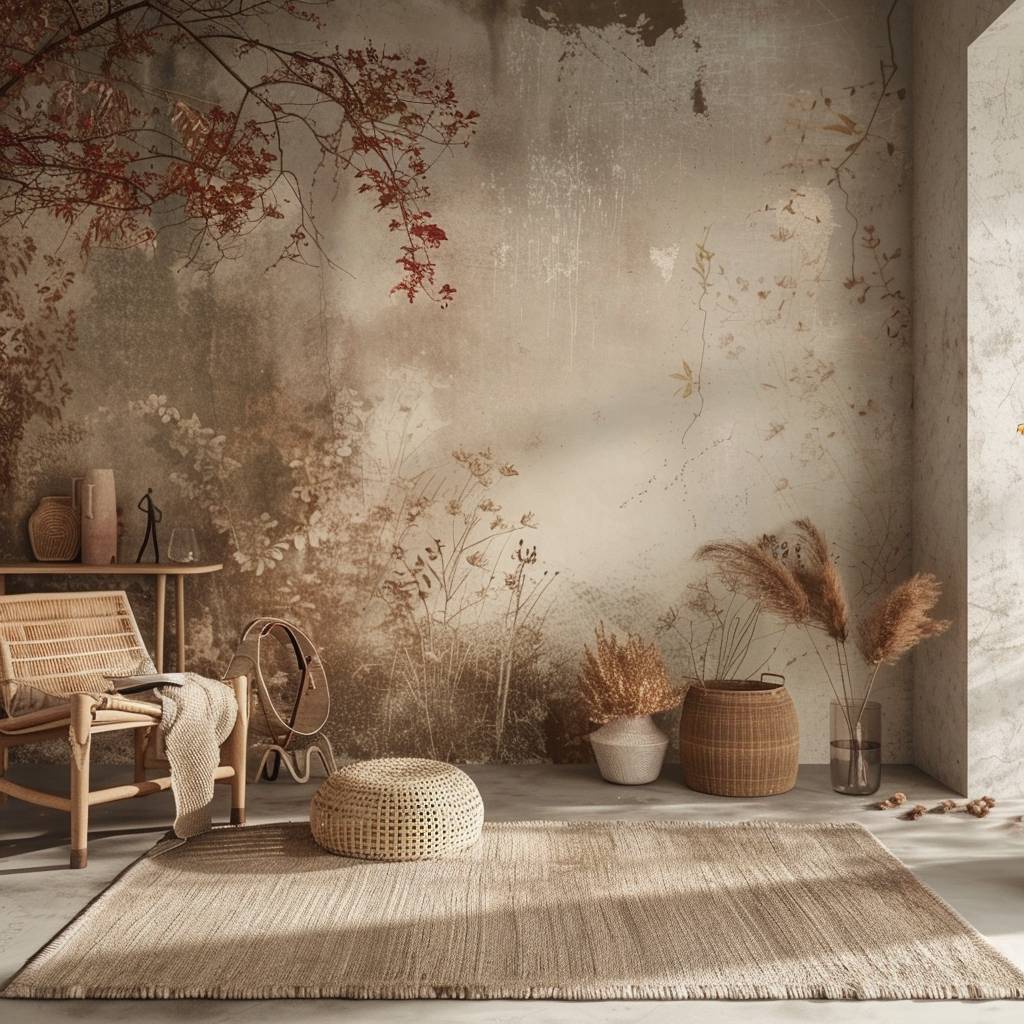 Ambiance chaleureuses et rustiques, teintes automnales, motifs naturels et floraux, détails fins, palette de bruns terreux et de beiges doux. --v 6.0