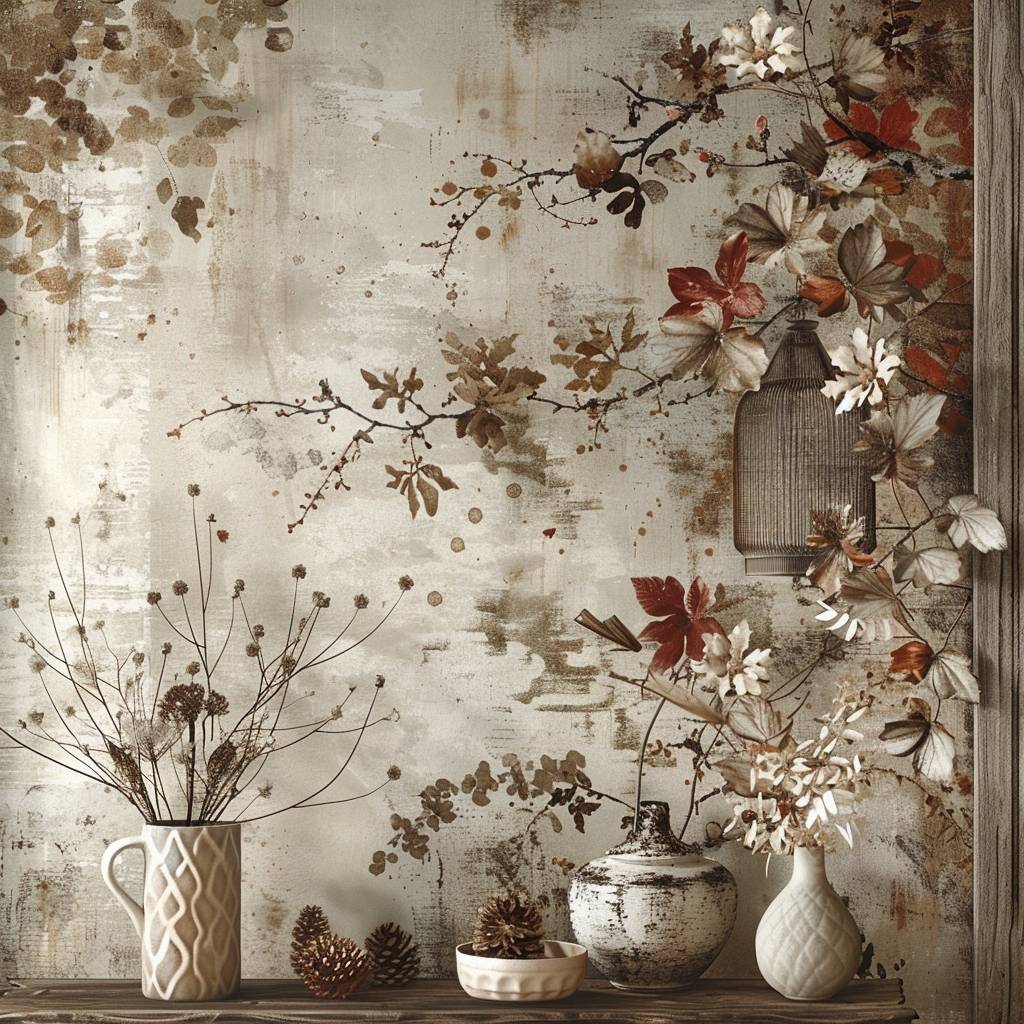 溫暖而鄉村的氛圍,秋季色調,自然和花卉圖案,精緻的細節,土棕色和柔和米色的調色板。