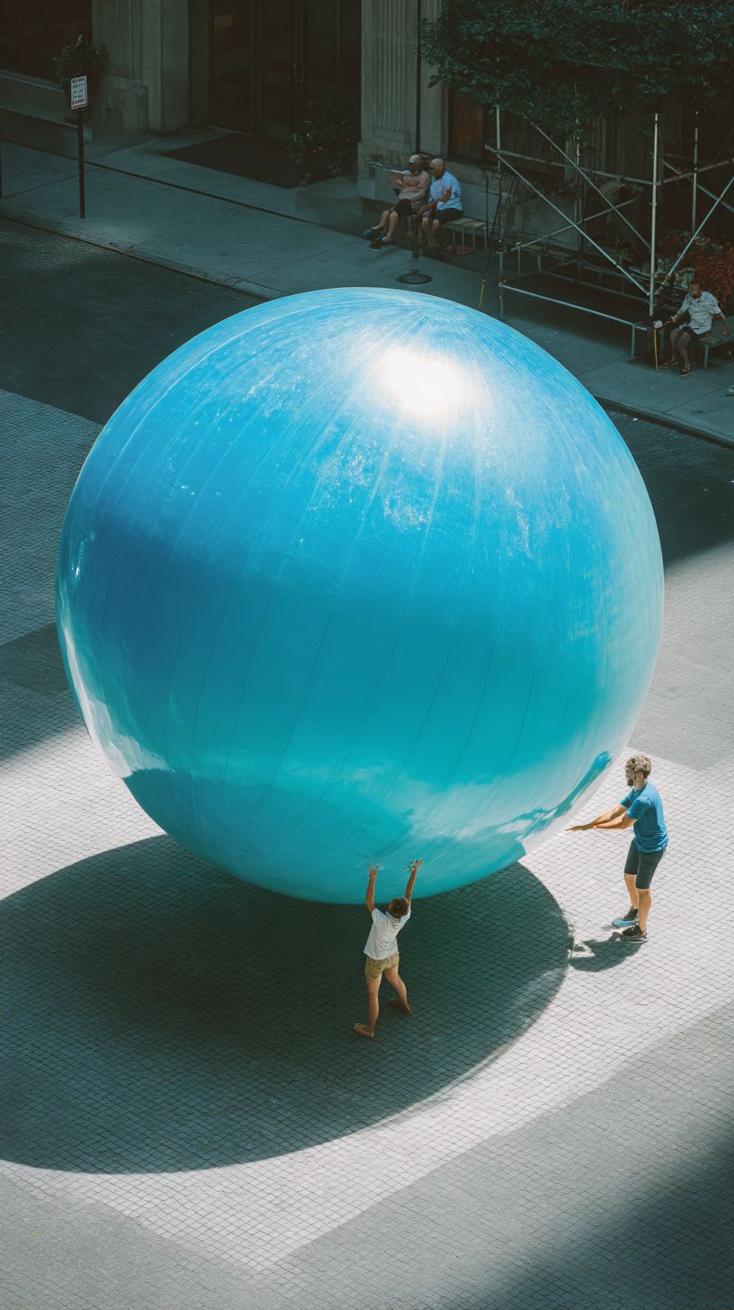 highly detailed, cinematic photograph, people pushing giant light blue Inflatable ball, natural and very bright color --ar 9:16 --stylize 150 --v 7.0