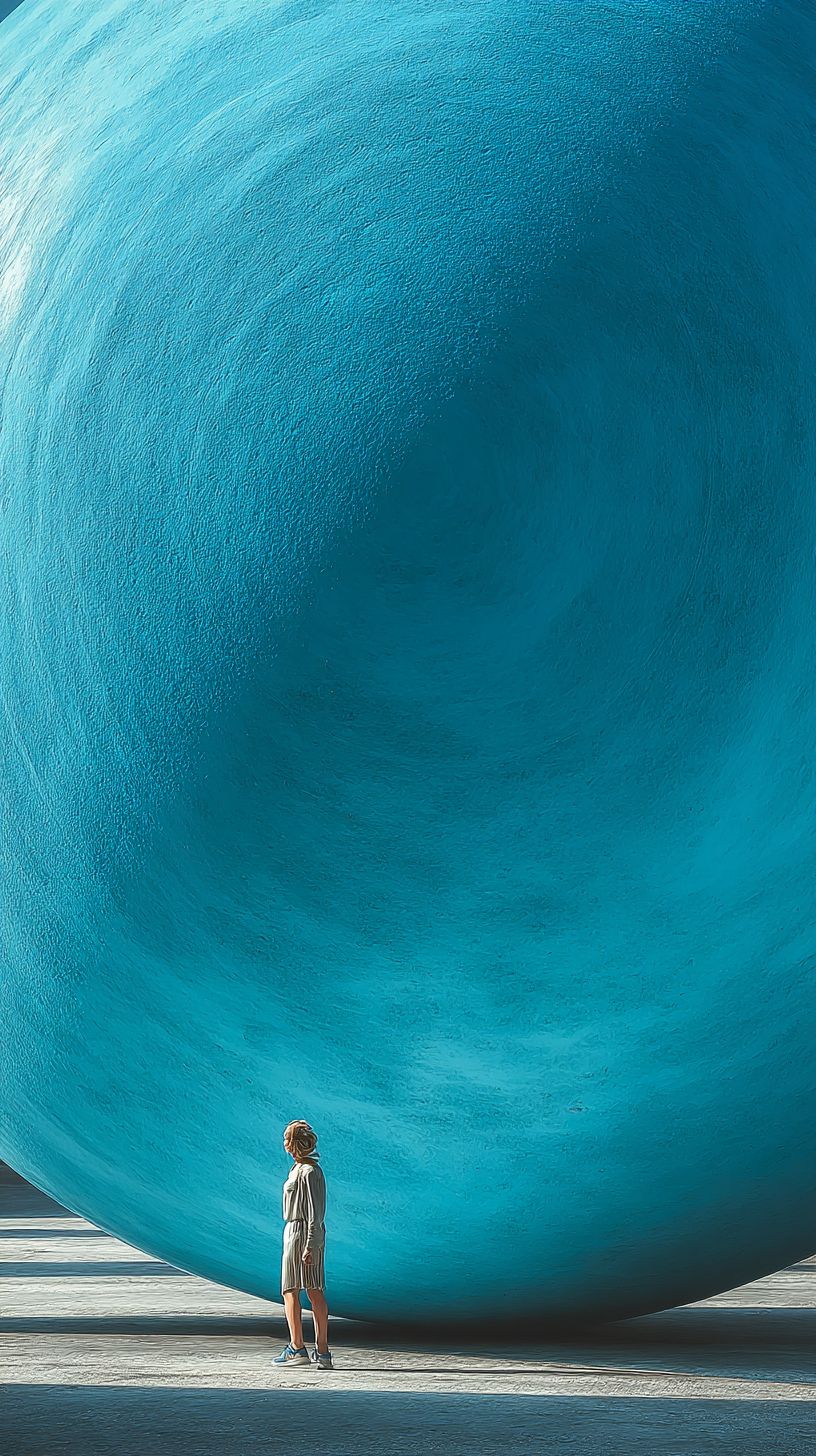 高度詳細的電影級攝影,人推著巨大的淺藍色充氣球,自然且非常明亮的色彩