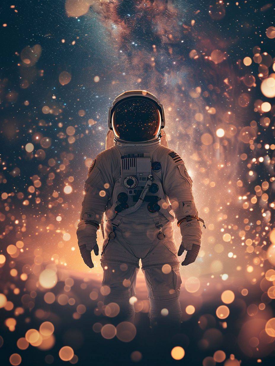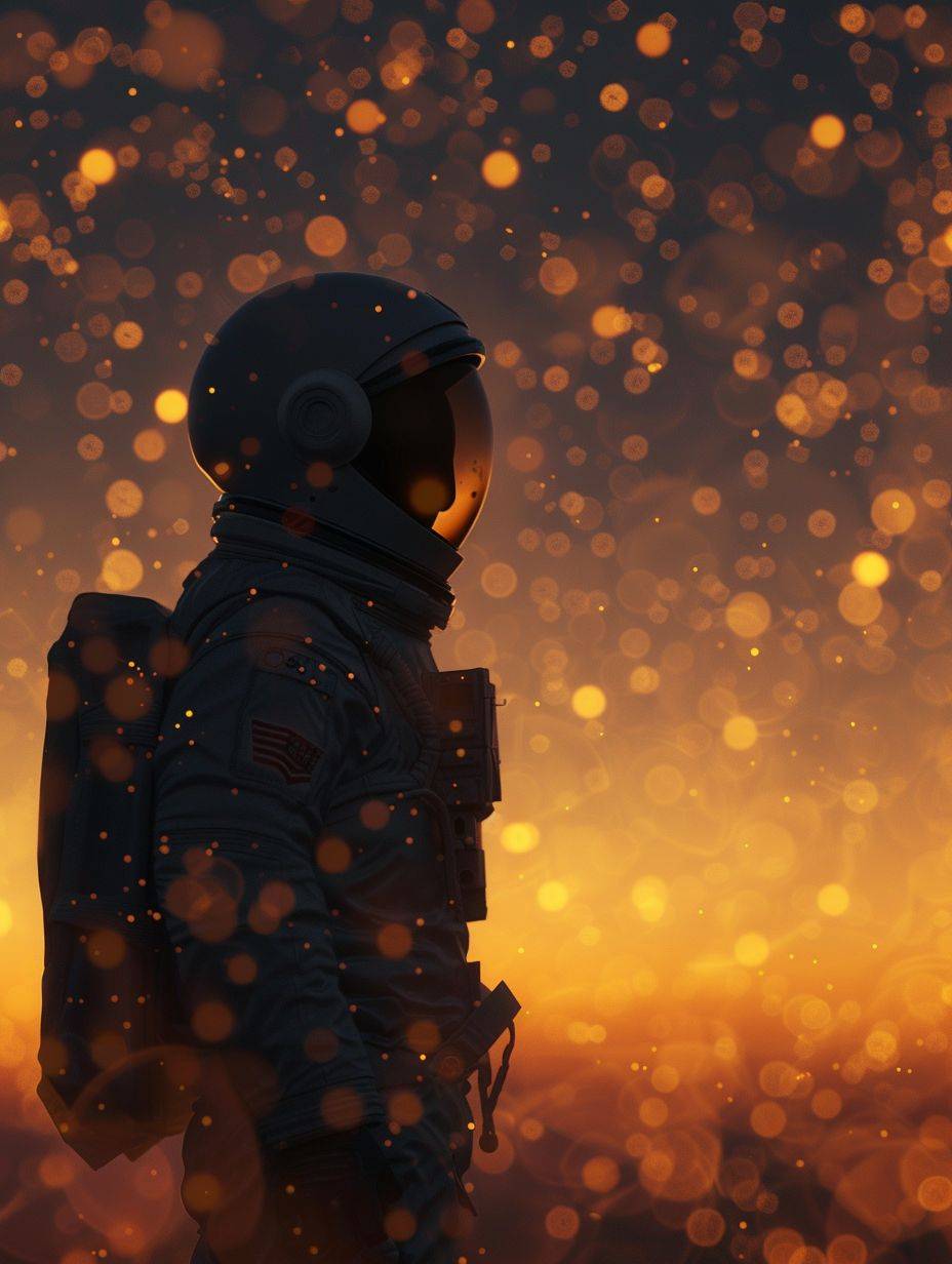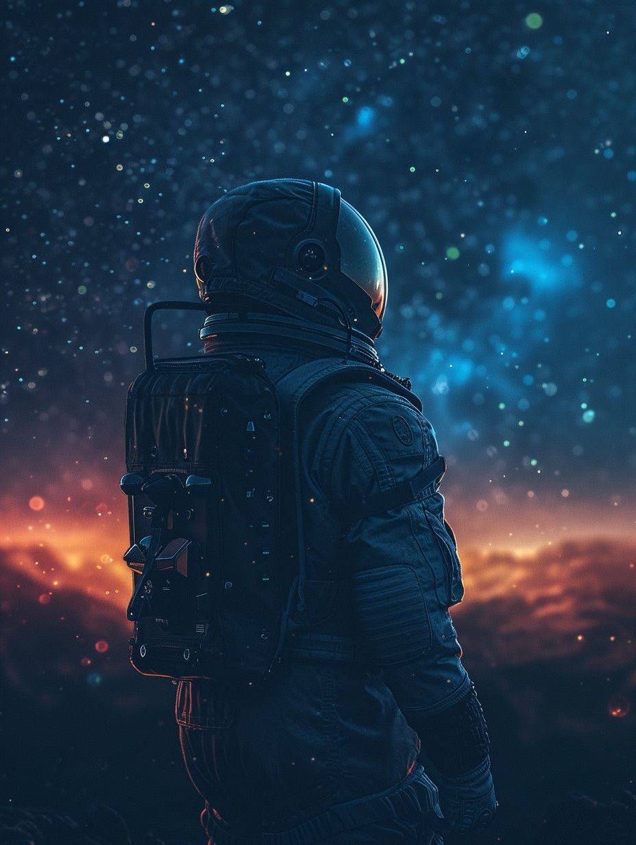 an astronaut stands in the dark with stars viewing the sunset | in the style of detailed fantasy art | 32k uhd | bokeh | pencil art illustrations, quantumpunk, imaginative characters | photorealistic detailing --ar 3:4 --v 6