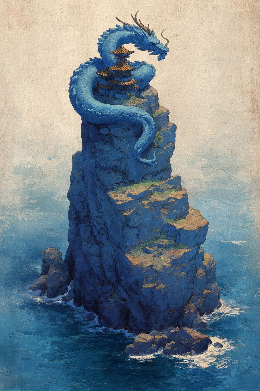 藍金色的龍繞著高聳的岩柱,岩柱頂部有一座小廟,岩柱底部是波濤洶湧的海洋
