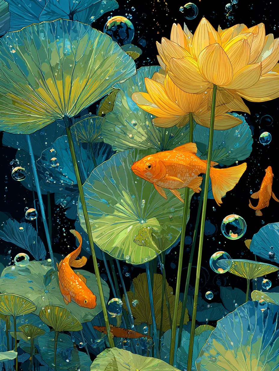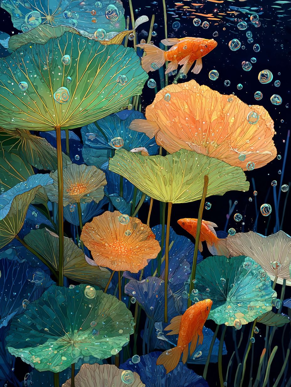 一幅美麗的水下場景插圖,描繪了荷葉和魚,風格受到Atey Ghailan和Moebius的影響。顏色是霓虹綠、黃色、藍色和橙色,插圖細節豐富,展現出色彩斑斕的幻想現實主義風格。形狀大膽,背景元素細緻,深黑色的水中有氣泡、水草和睡蓮。