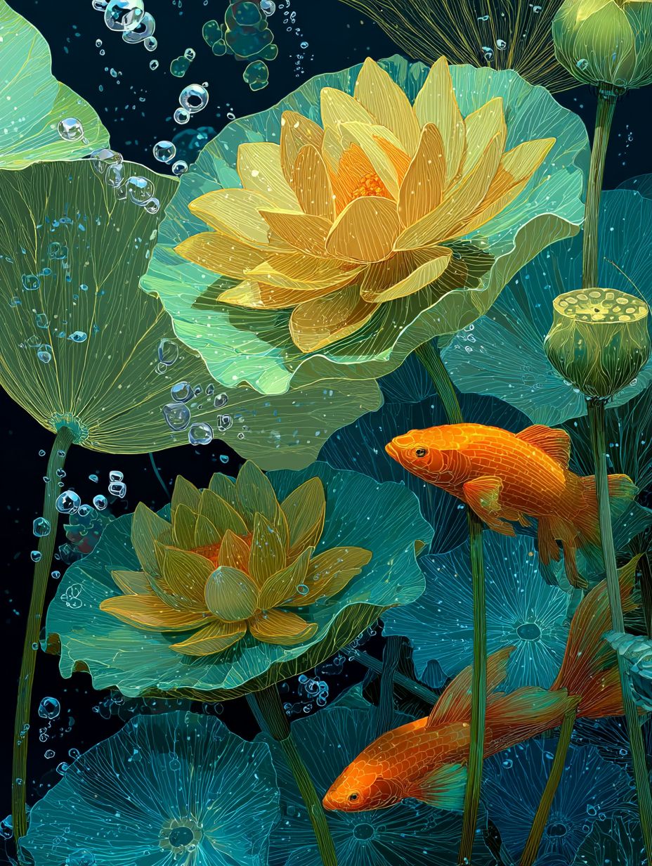 這是一幅美麗的水下場景插圖,描繪了蓮葉和魚,使用了霓虹綠、黃、藍、橙色的顏色,具有超細緻的幻想現實主義風格