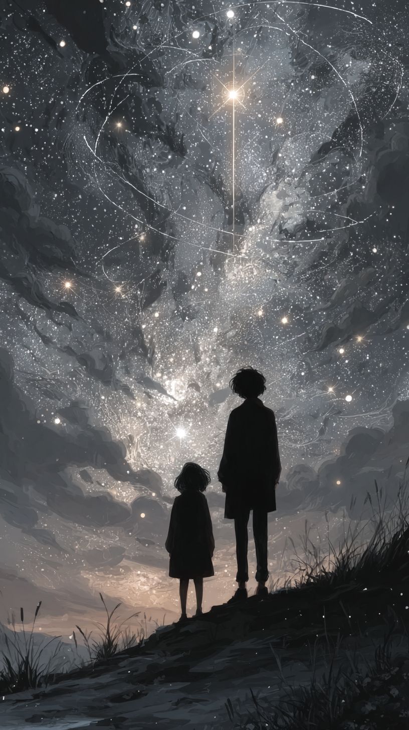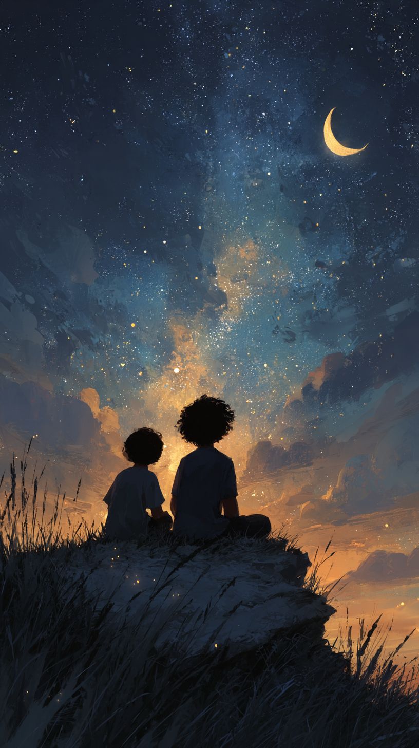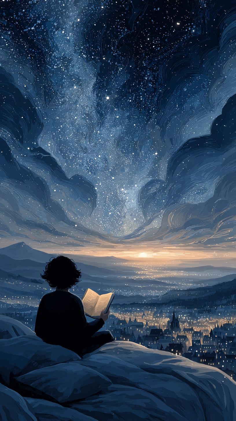 Mimpi sampai ke bintang. Illustrasi --ar 9:16 --exp 50 --raw --stylize 400 --v 7.0