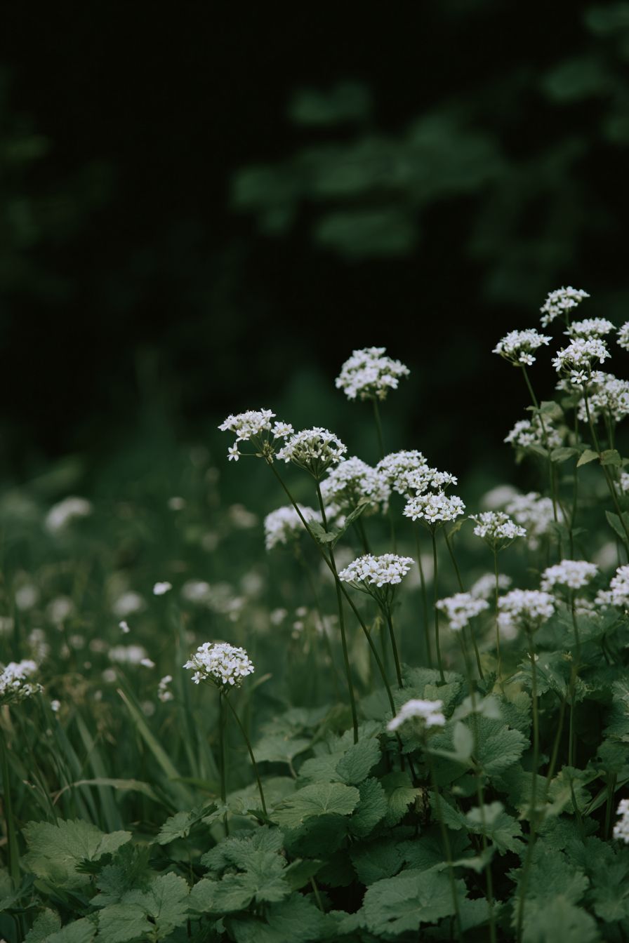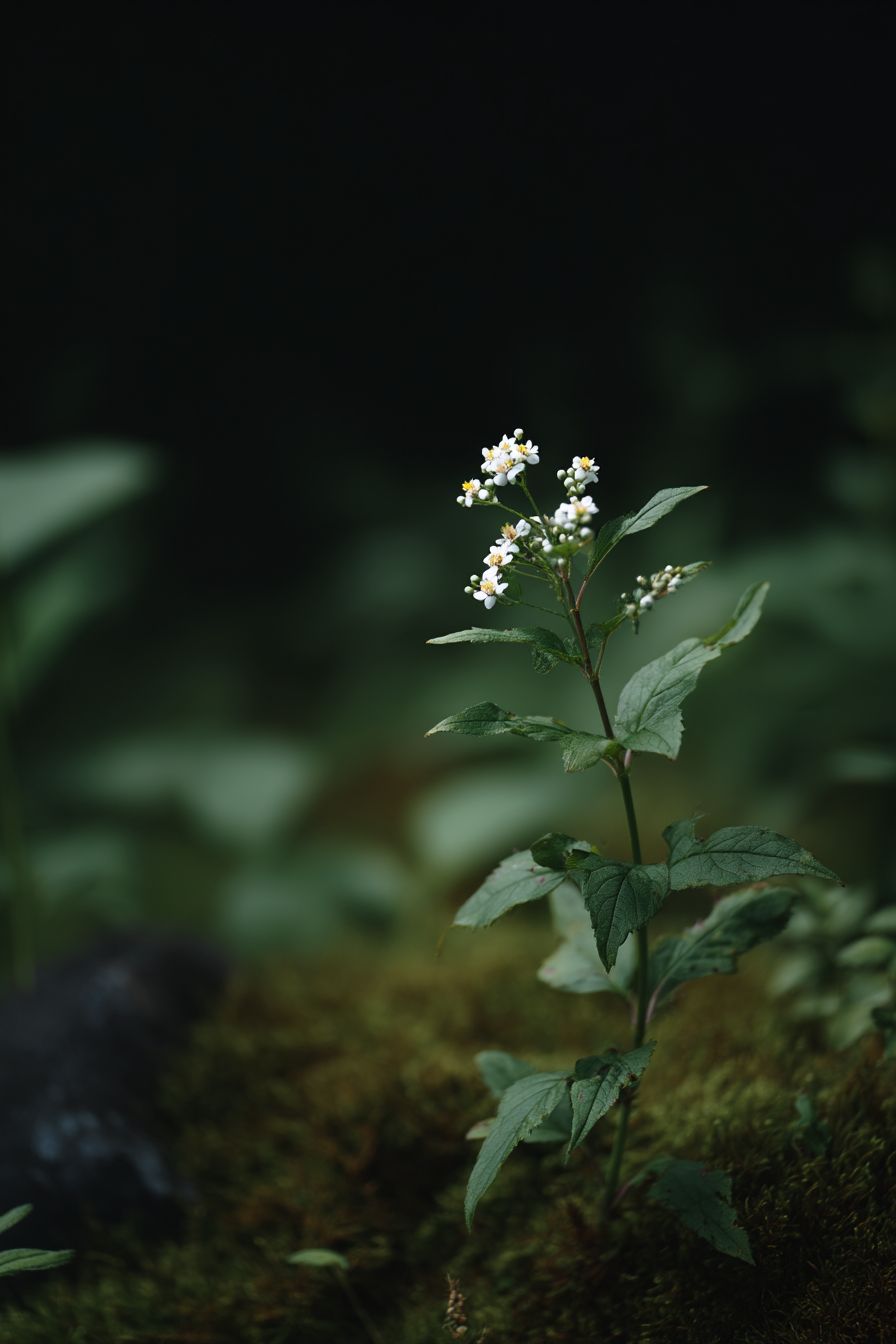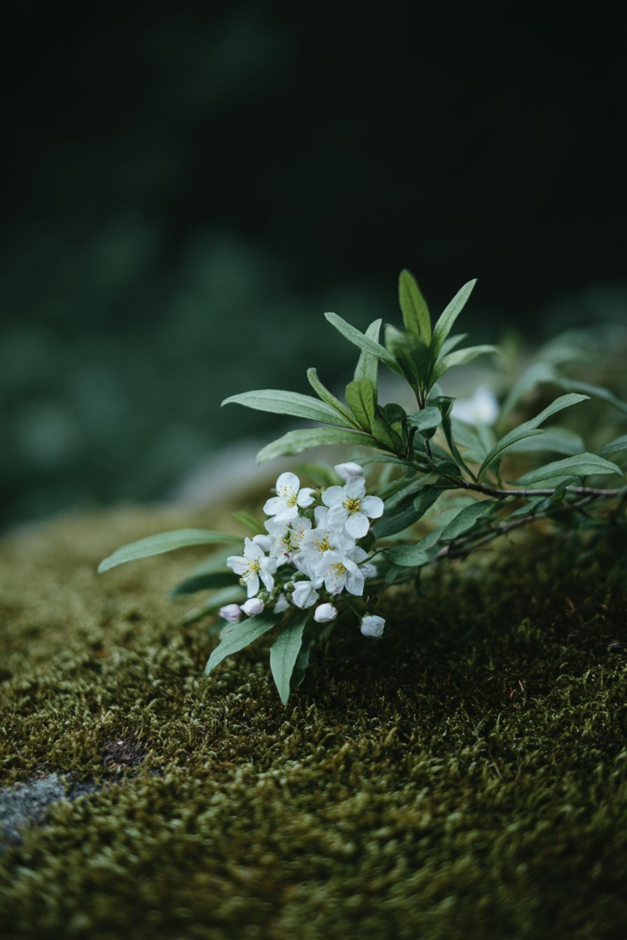 一組綠色葉子和白色花朵的特寫,帶有鄉村風格美學,暗黑學術美學,背景為深色。包含深綠色色調,情緒化的美感,電影感,通過佳能EOS R5相機拍攝。生動花園的自然背景,描繪了苔蘚森林中的野生植物的自然場景。低角度拍攝展示了野花花園中的深綠色葉子和覆蓋苔蘚的地面。這張高分辨率的自然攝影捕捉了深綠色葉子和苔蘚地面的美,風格以Unsplash攝影、極簡主義、自然攝影、自然啟發的裝置為主,採用深綠色調,超現實。