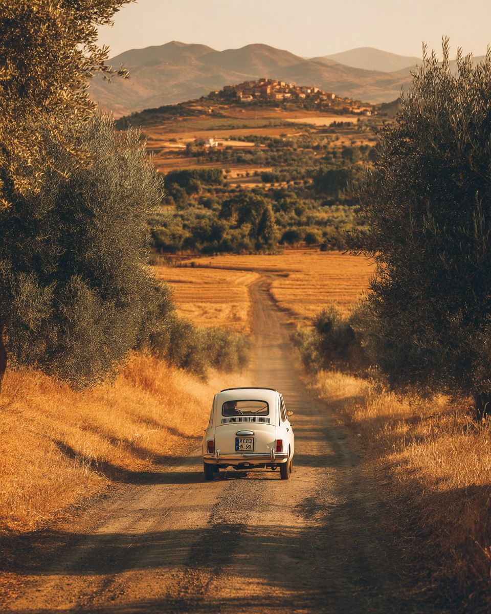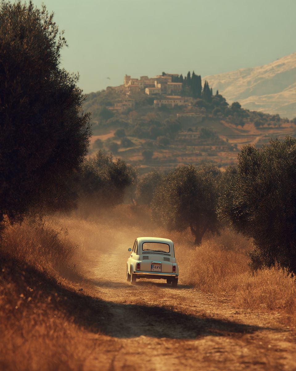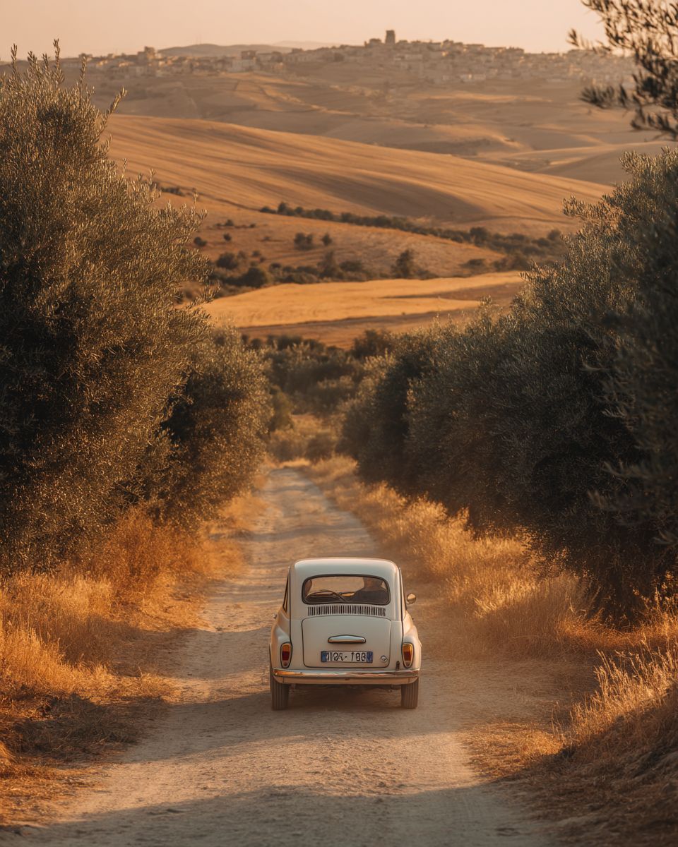 復古的白色菲亞特600在塵土飛揚的鄉村道路上行駛,駛向遠處陽光照耀的西西里山頂村莊,1970年代的鄉村風光,溫暖的金色光芒,兩側是橄欖樹,乾燥的小麥田,電影般的氛圍,懷舊的意大利明信片風格,超真實的70年代復古照片