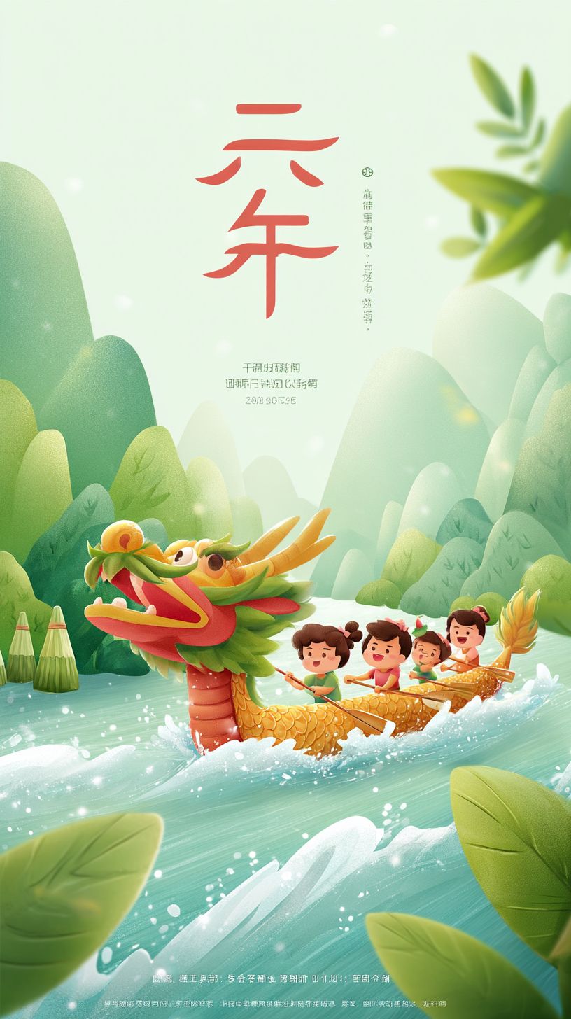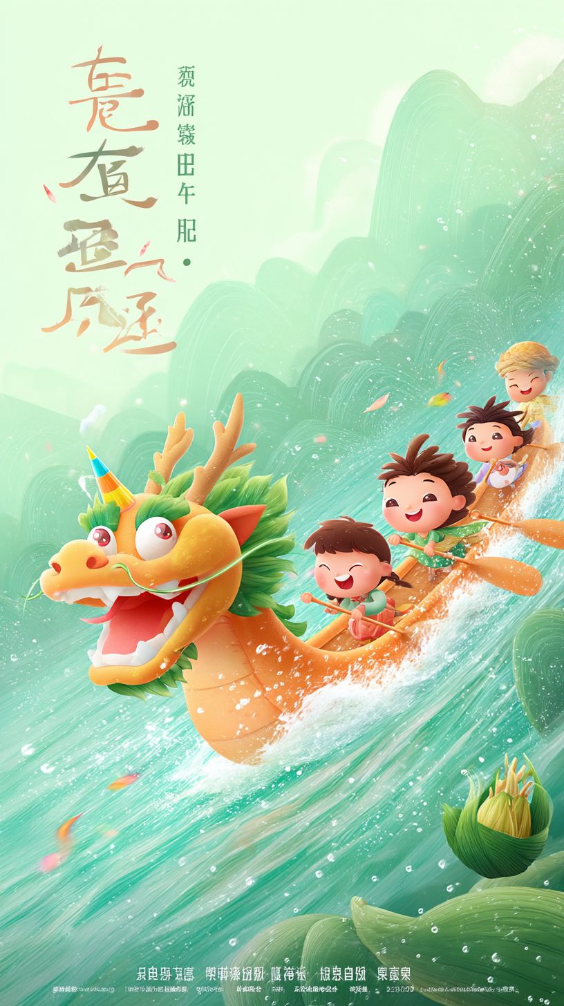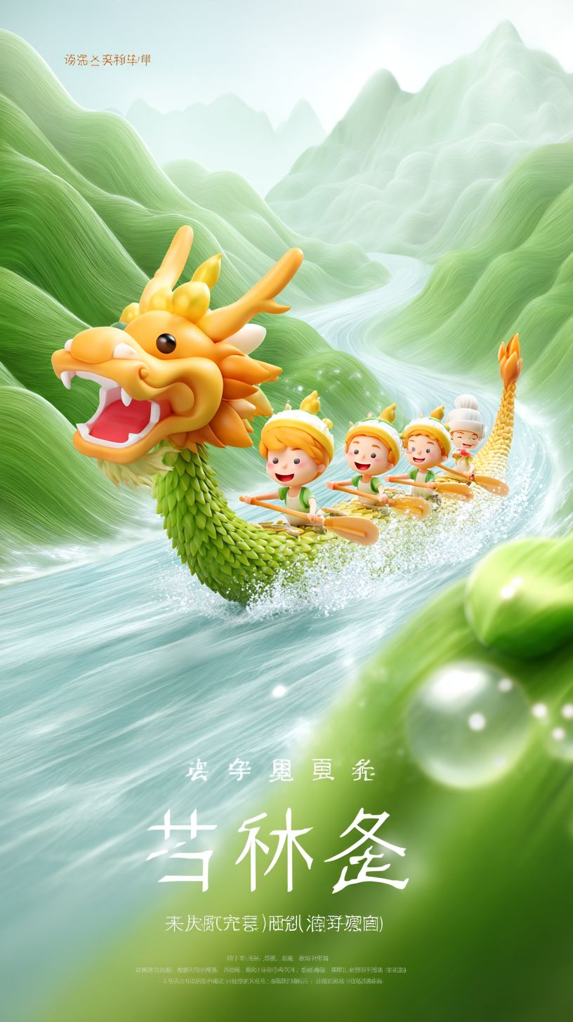 一幅關於中國龍舟節的海報。主要主題是一隻三維龍舟在河中奔騰,河面波光粼粼。龍舟的船頭是獨角獸,船尾是龍尾。五個小人興奮而快樂地劃著長龍舟,臉上洋溢著興奮和快樂的表情。前景中有粽子、艾草等龍舟節元素。背景是起伏的綠色山脈漸變。