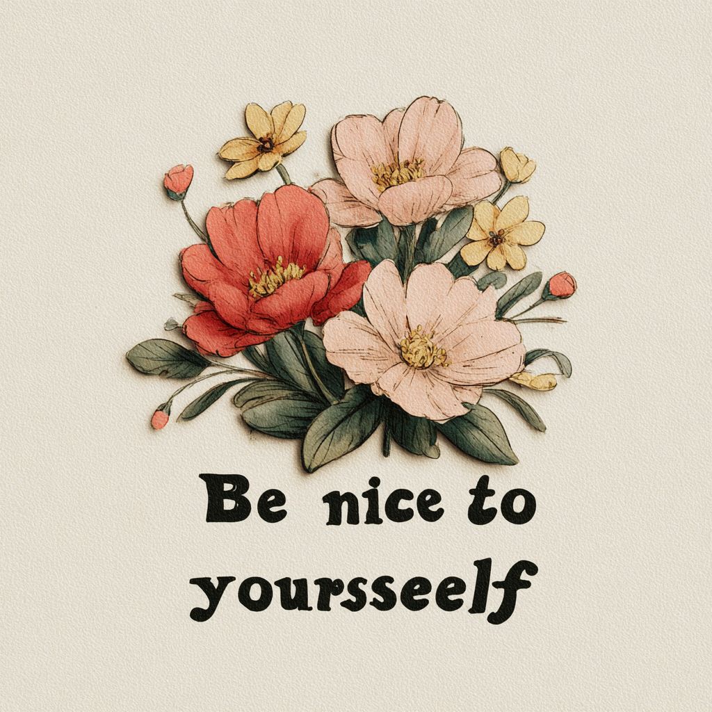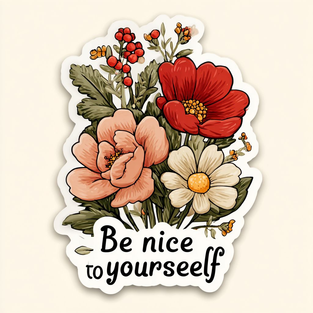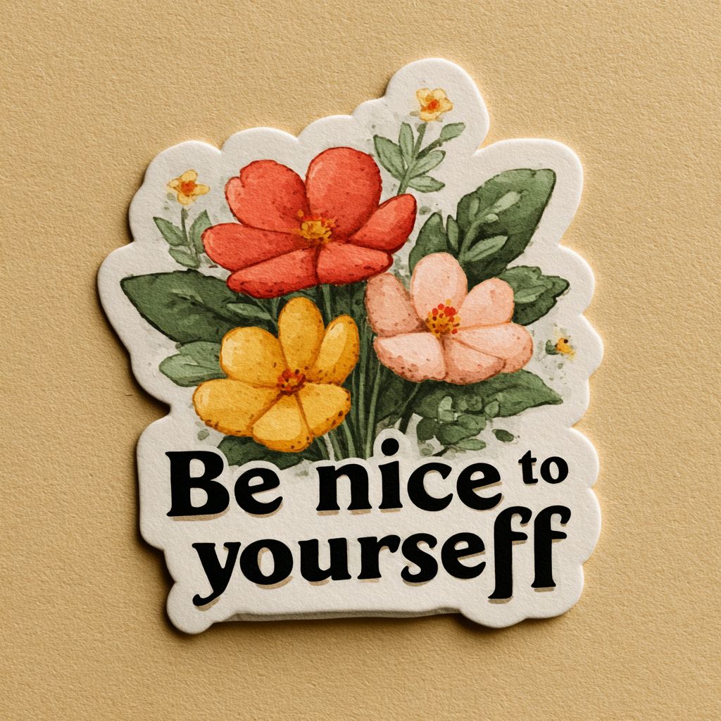 A sticker with the text "Be nice to yourself" and flowers on a white background, in a bold font with a sticker-like style.Cartoon,Minimalist style,Adorable,Full body image,Simple drawing ,white background --v 7.0 --s 250