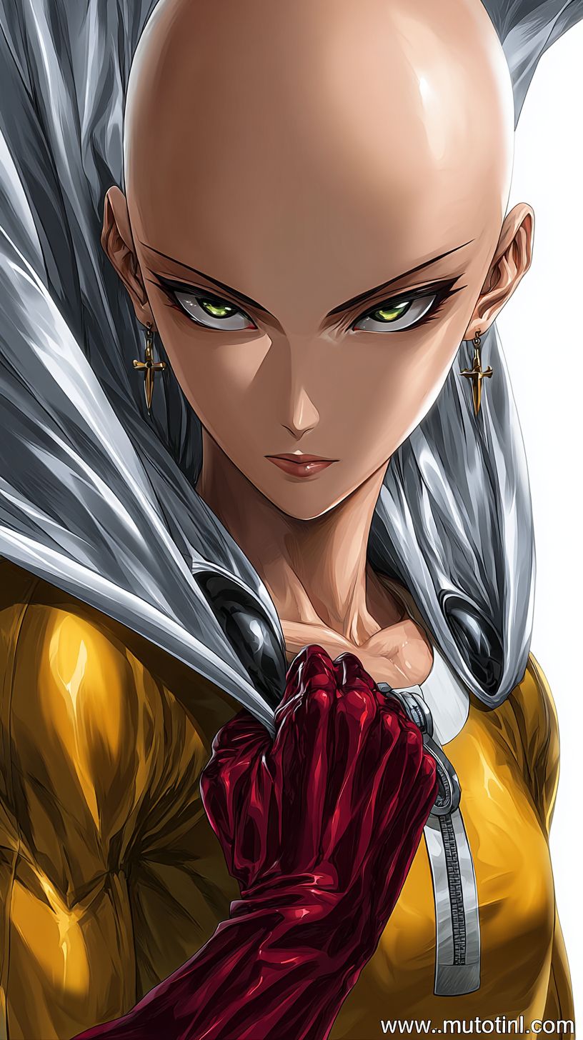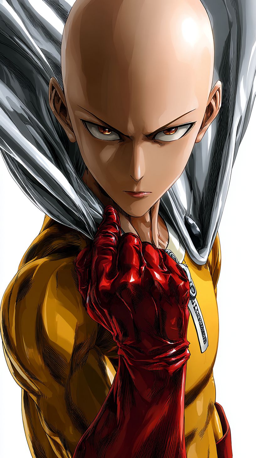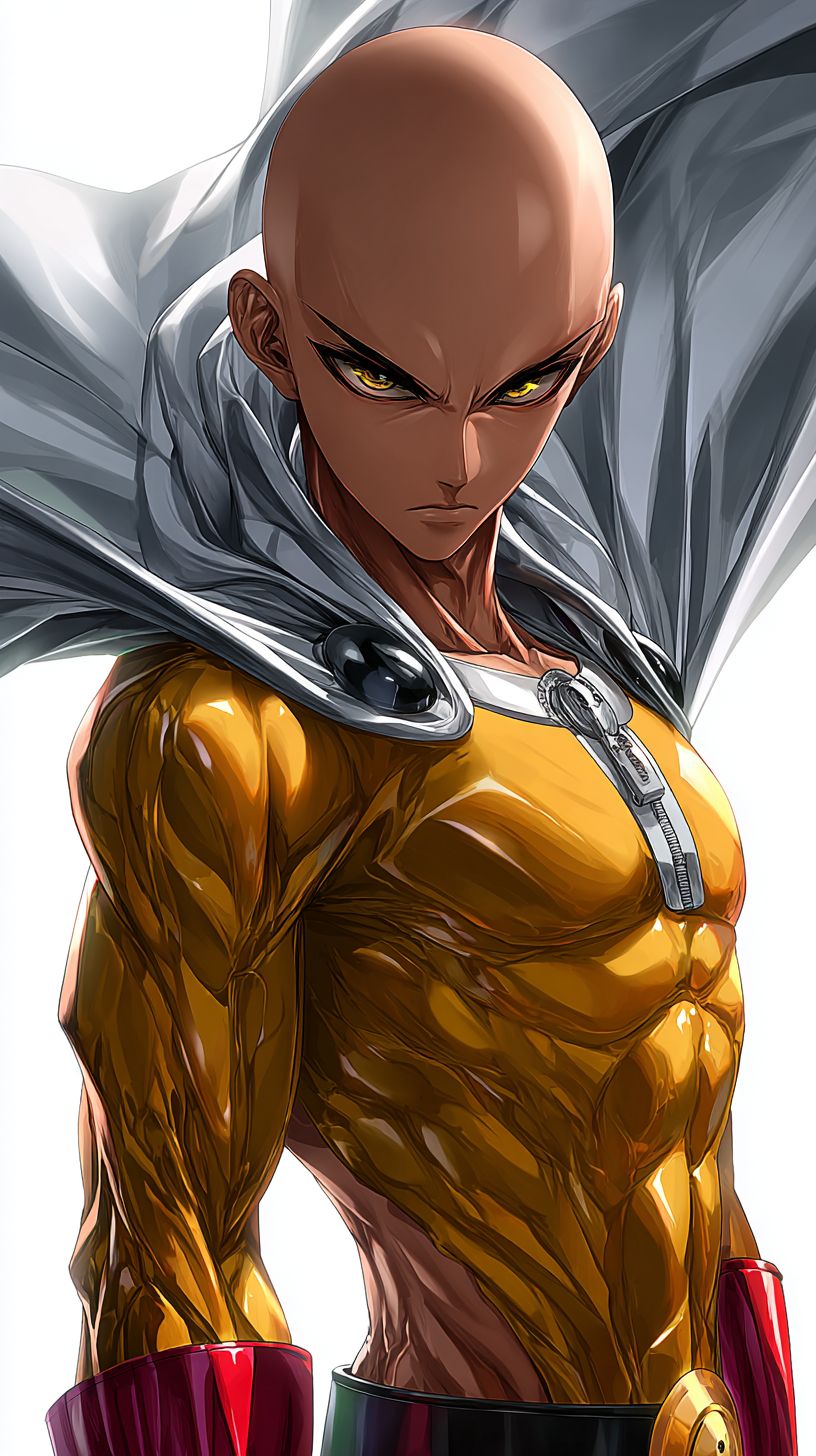 一幅精彩的職業32K UHD 馬克筆特寫畫,描繪了埼玉(《一拳超人》),一位光頭、瘦但清晰肌肉發達的男性超級英雄。他穿著標誌性的黃色高領連身衣,紅色手套,白色斗篷柔和地在他身後飄蕩。他的陽剛面龐無表情,目光空洞,略顯無聊——眉毛平直,嘴唇保持直線——強調了他情感上的冷漠和滑稽的不屑態度。他的光頭微微反射出光線,展現出逼真的肌膚質感和陰影。運動員般的胸部和肩膀清晰可見,線條柔和,但避免任何女性特徵或柔軟感。畫作使用了乾淨的色彩搭配,包括黃色、紅色和自然膚色。背景為純白色。藝術風格柔和,手工繪製,受到村田雄介和鳥山明的啟發,線條清晰,光影明亮,營造出中性但標誌性的氛圍。強壯的男性解剖結構和姿態強調了他的男性身份,同時保持了埼玉獨特的情感基調。