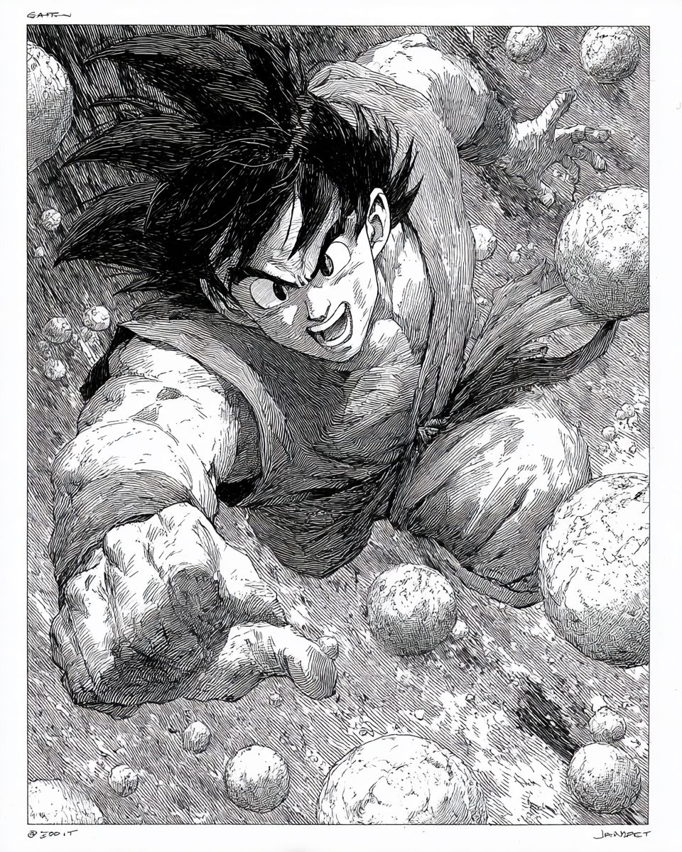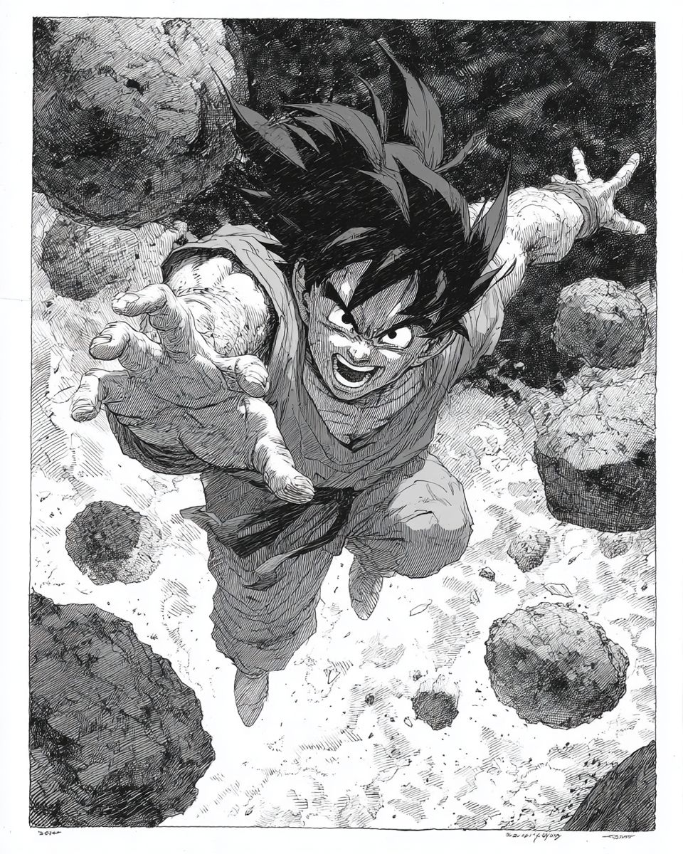 black and white ink illustration, dynamic manga style, highly detailed line art, intense shading, dramatic action pose, powerful Saiyan warrior with spiky hair and muscular build, inspired by Dragon Ball Z, flying rocks and energy waves, Japanese shonen comic style, ink on paper texture, cinematic framing --ar 4:5 --stylize 250 --v 7.0