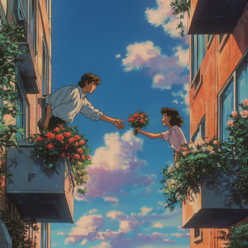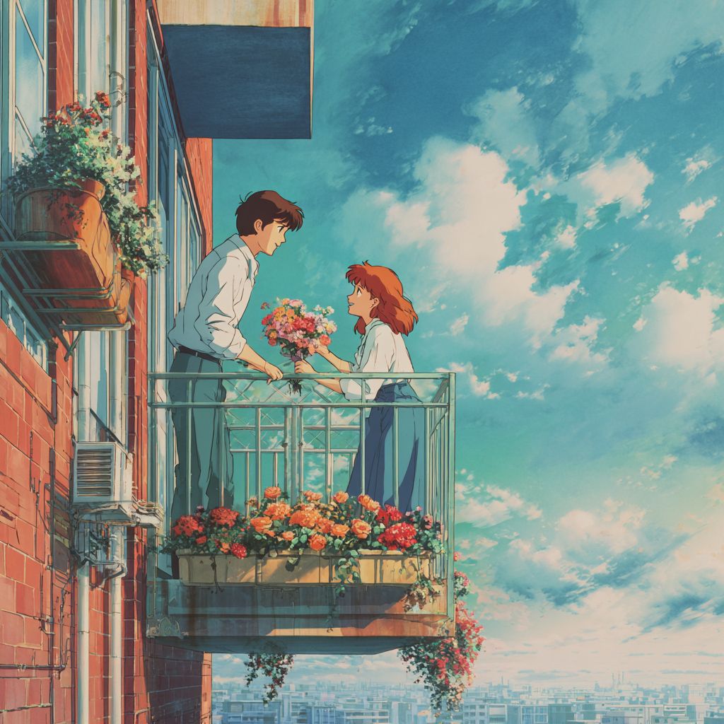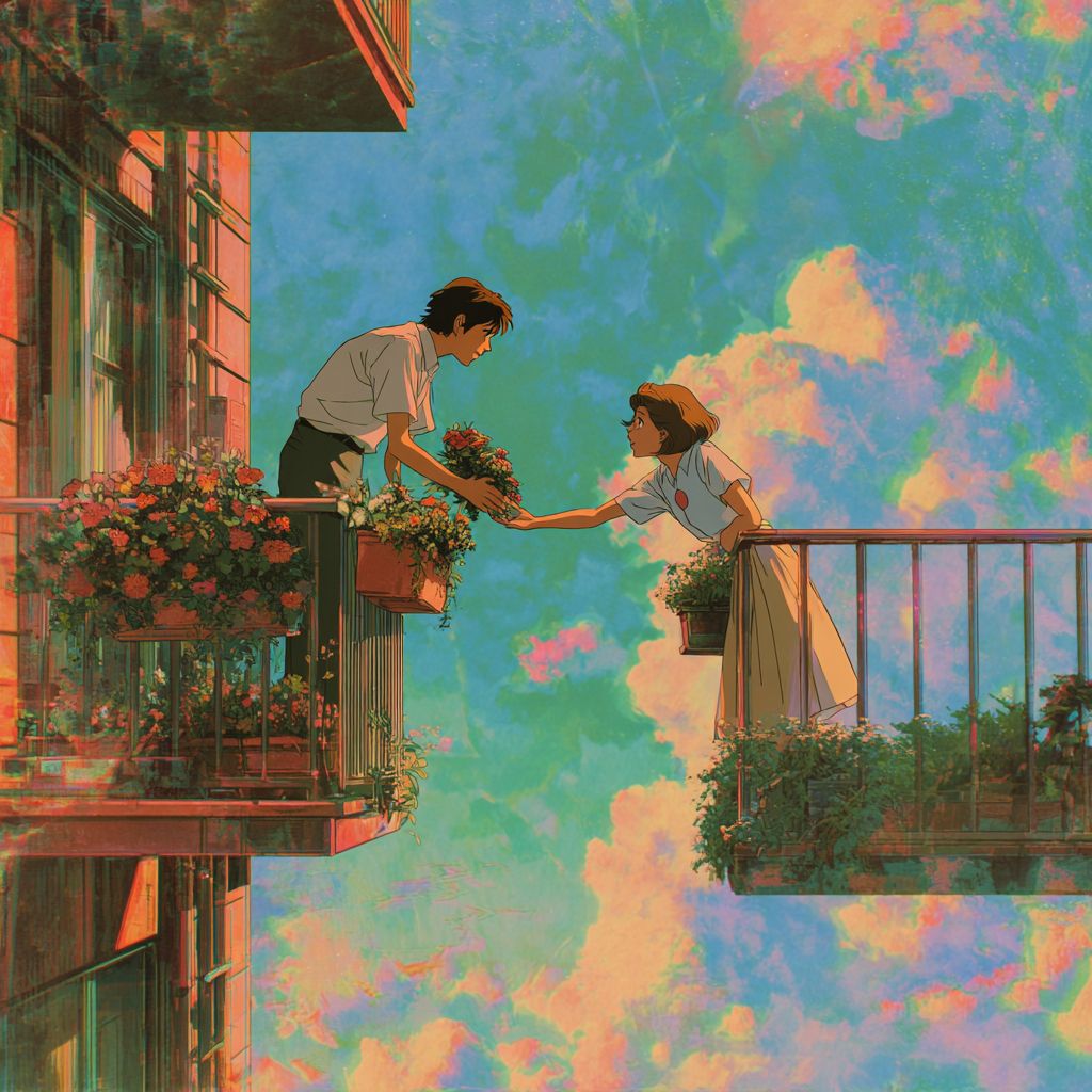 90年代動漫風格,一名男子在左側陽台上把花遞給他的女朋友,她在右側陽台上伸手接花。兩人手臂向彼此伸出,居住在相鄰公寓的不同樓層。場景設置在白天,背景能看到天空。這幅場景結合了迷幻的藝術風格和多彩的動漫美學,靈感來自川尻善昭、北條司和河本俊夫的風格。